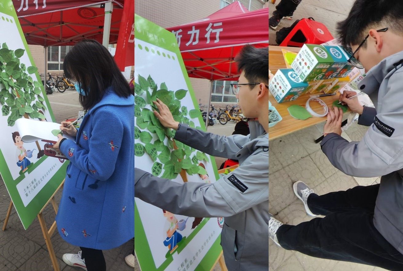 本次活动分为三大板块。第一板块“种植绿色,拥抱未来”,环保志愿者发布与植树节有关的问题,引导现场同学们踊跃参加,通过知识竞答更好地认识植树,了解植物,同时获得植物种子。第二板块“与绿有约,共绘图景”。活动现场,环保志愿者积极宣传生态文明知识,让同学们意识到保护生态环境的重要性。志愿者引导同学们在主题海报上签名留念,对参与活动的同学发放绿植种子和土壤、花盆,鼓励同学们在体验劳动实践乐趣的同时为营造绿意盎然、生机勃勃的校园环境作出贡献。第三板块“变废为宝,走向春天”。以10个废旧塑料水瓶置换1次投壶或转盘的机会,随机抽选绿植,精心养护,为生活添一抹绿意,绽放出属于自己的春天。