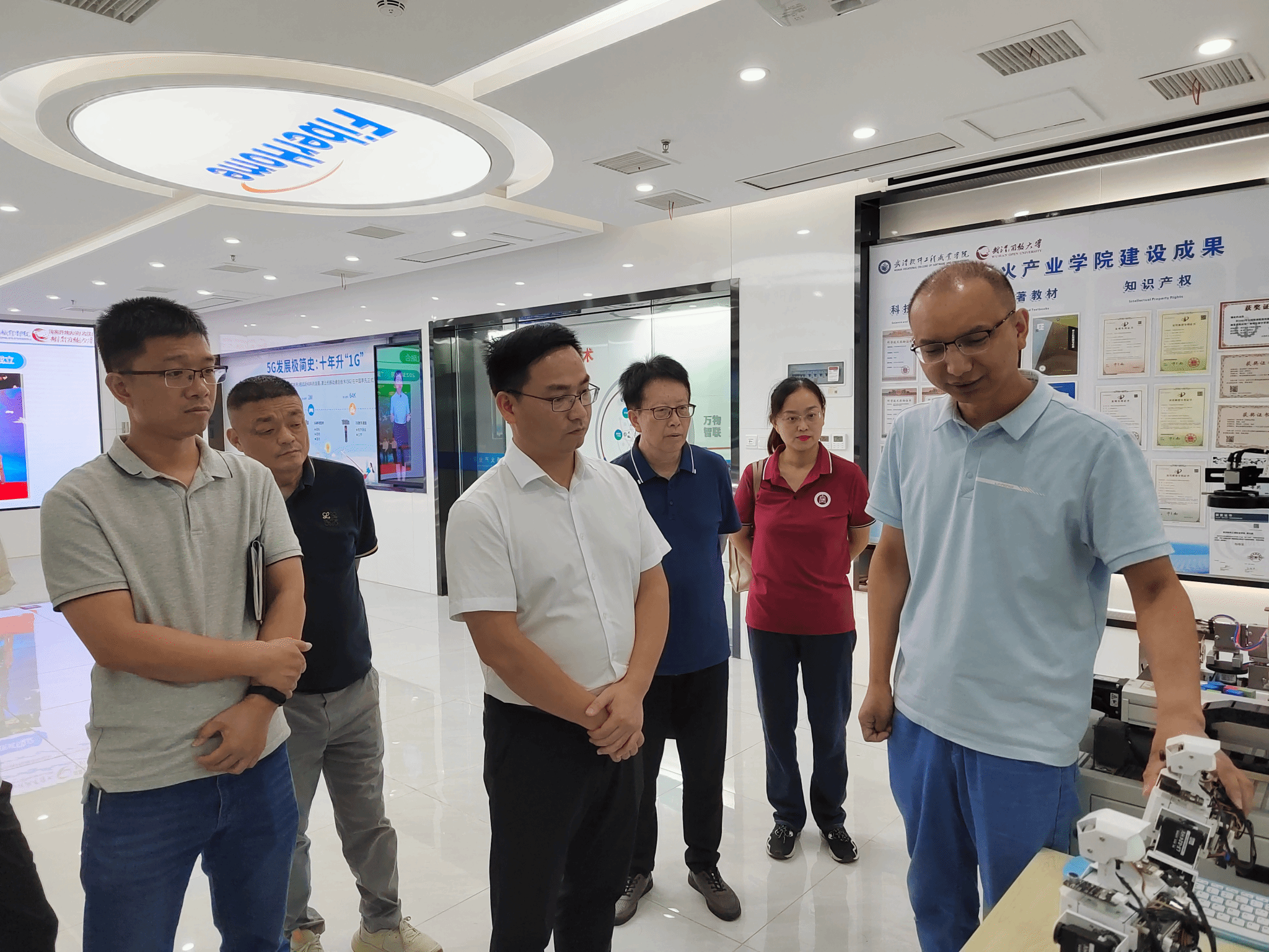 调研团队实地考察了武汉软件工程职业学院烽火产业学院展厅及校企共建实训基地,详细了解武汉软件工程职业学院成功获批“复杂零部件智能检测与识别湖北省工程研究中心”的申报过程及建设情况。
