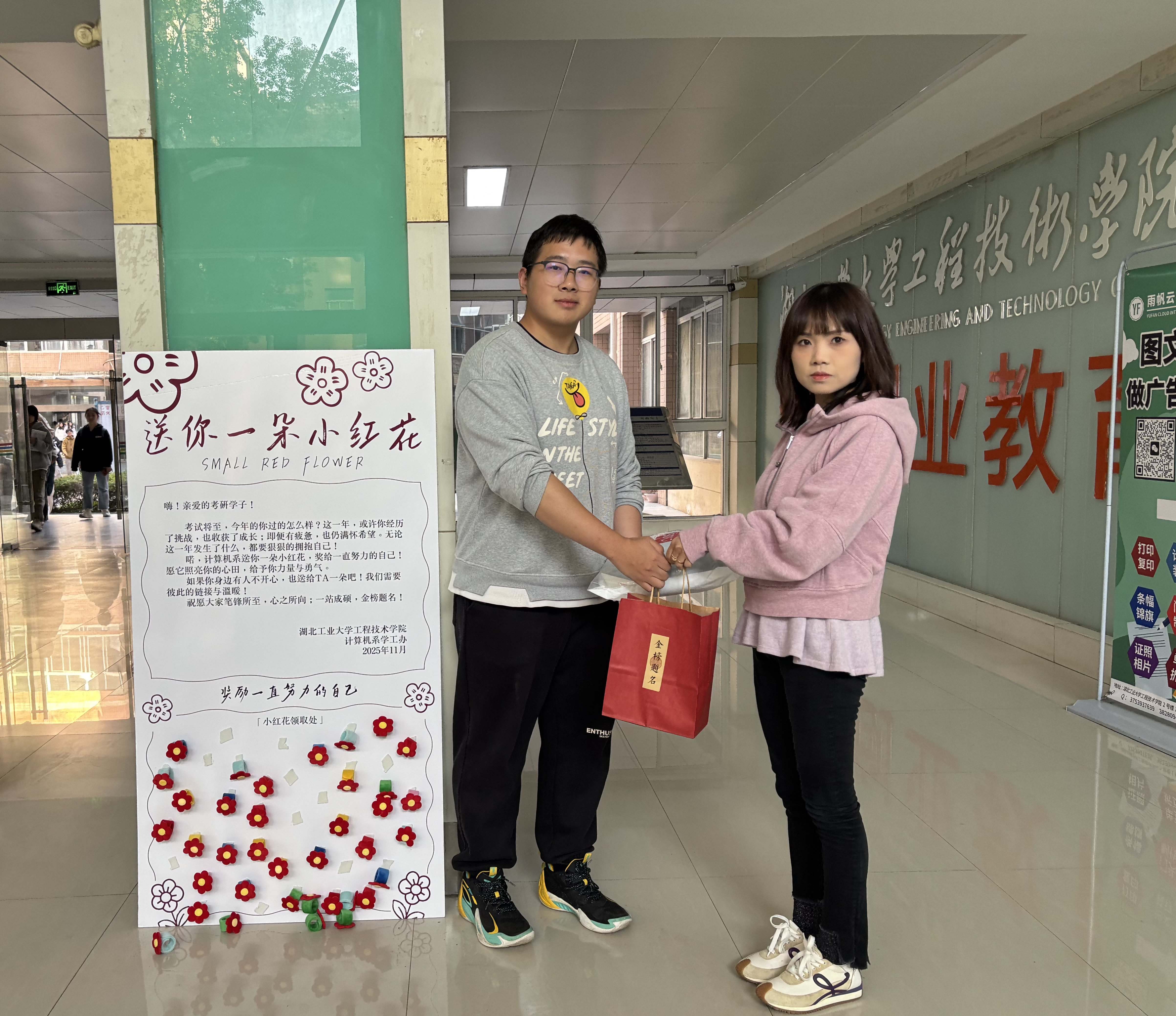 活动现场设有“小红花领取处”,成为师生互动的一处温馨角落。小红花作为一份鼓励的象征,附有“愿它照亮你的心田,给予你力量与勇气”的寄语,传递出全系老师对同学们的真诚祝愿。不少同学在此领取并佩戴小红花,也有同学为同伴代领,在交流中彼此鼓励。