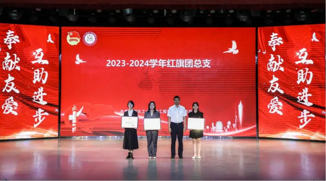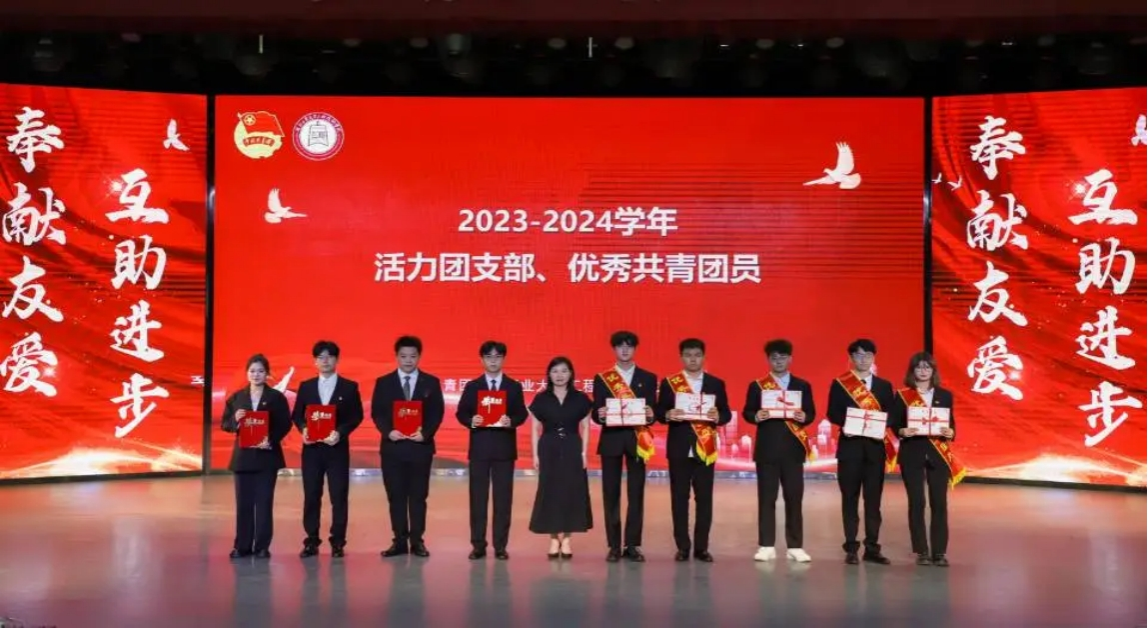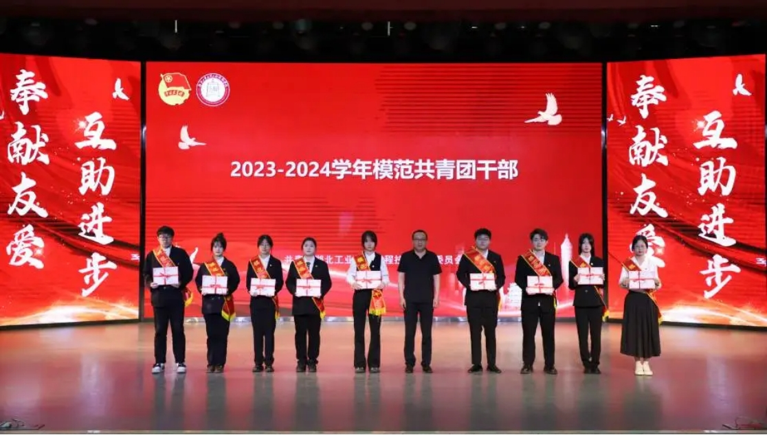 第二篇章,星辰青年。团委书记庞雯宣读《关于表彰湖北工业大学工程技术学院2023-2024学年五四先进集体和先进个人的决定》。学院领导为受表彰集体和个人代表颁发荣誉奖牌和证书。现场为109名青年举行了入团宣誓仪式。