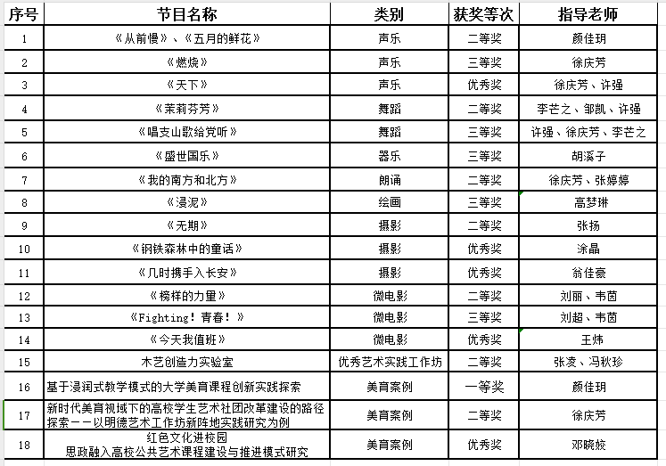 近日,湖北省教育厅公布了湖北省第八届大学生艺术节“三优一案例”(优秀文艺节目、优秀美术作品、优秀艺术实践工作坊和高校美育改革创新案例)评选结果。我院报送的多个文艺节目和案例从此次申报的两千余个作品中脱颖而出,荣获一等奖1项、二等奖7项、三等奖5项、优秀奖5项,获奖数量高达18项,获奖数量取得新突破!