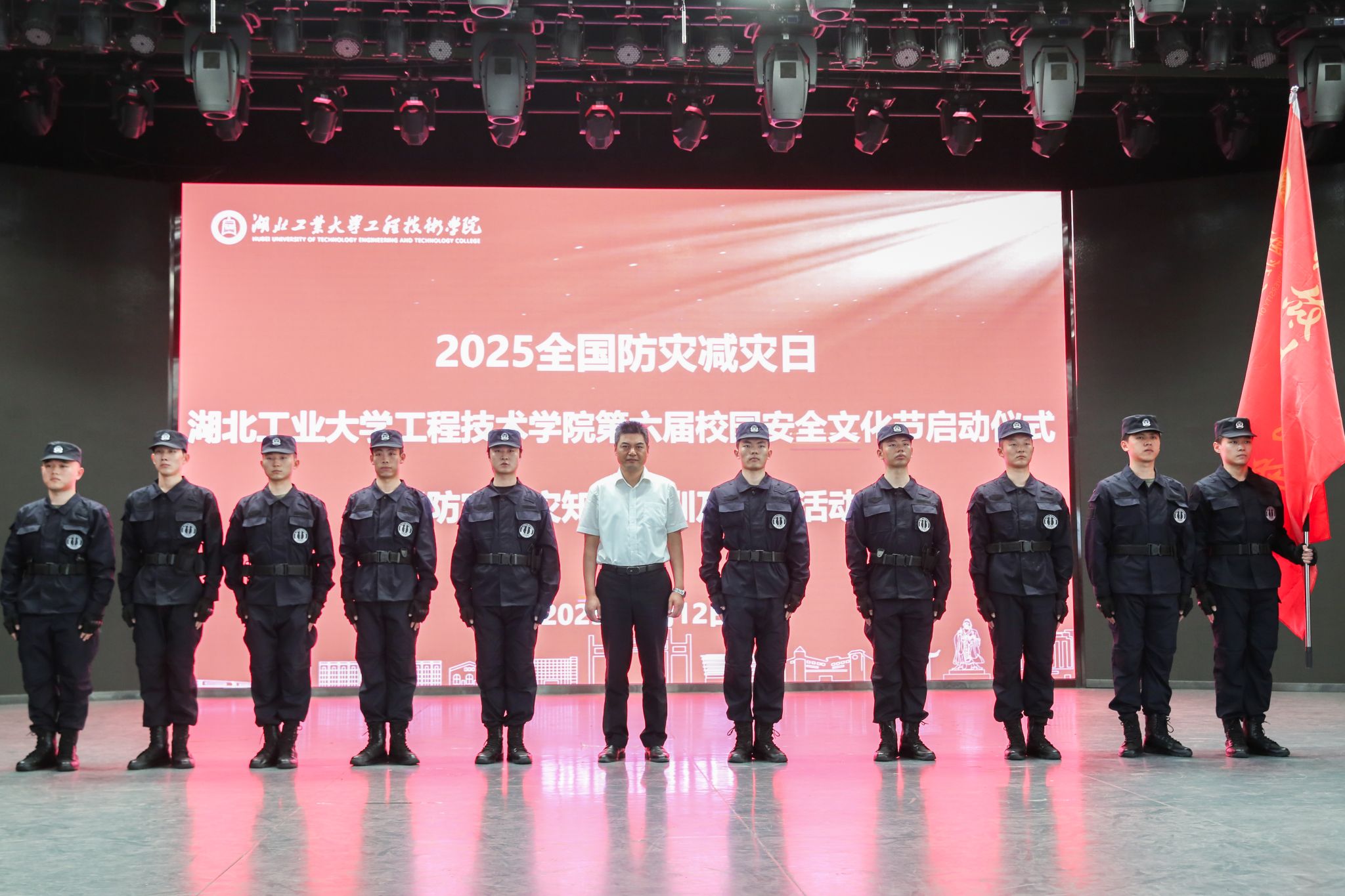 活动中,朱爱军、范青分别为学院第一届高校卫士服务队、第二届消防应急服务队授旗。高校卫士服务队带来了精彩的搏击摔擒术表演,展现了扎实的应急处置能力,赢得了阵阵掌声。