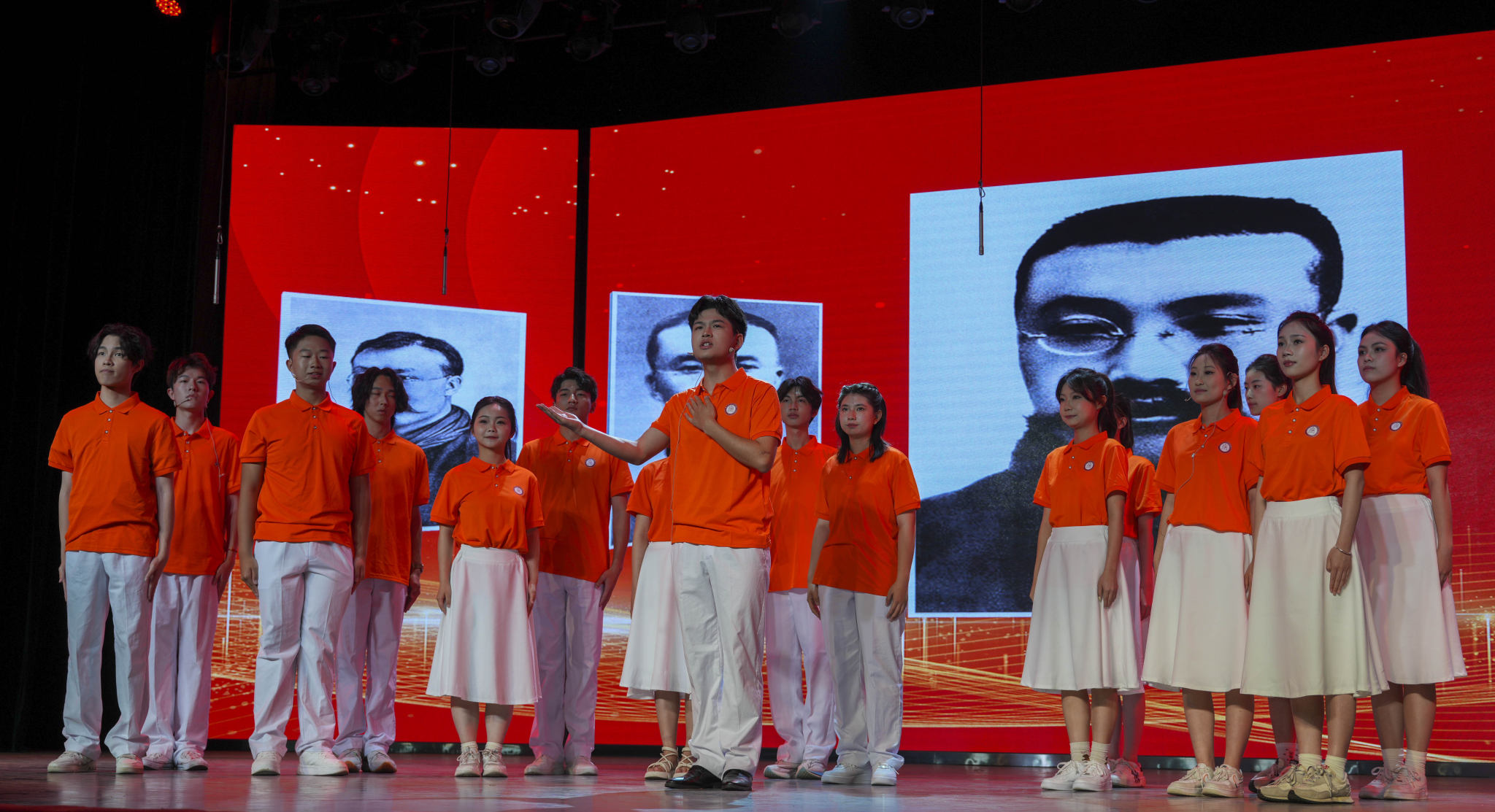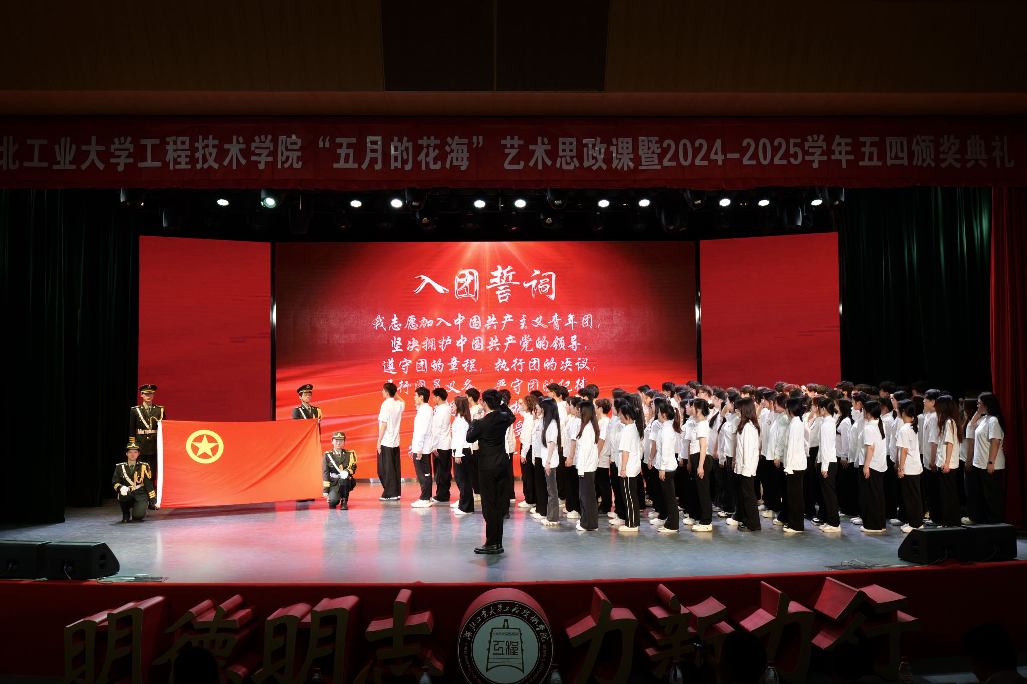 在第二篇章“传承·赤子心”中,大学生艺术团知行主持队、臻艺话剧团带来情景舞台剧《百年风华》,以李大钊、邓稼先、黄文秀、黄旭华四位共产党员的奋斗故事为经纬,让思政教育从书本走向立体时空。同时,学院100名新发展团员现场进行了庄严的入团宣誓。