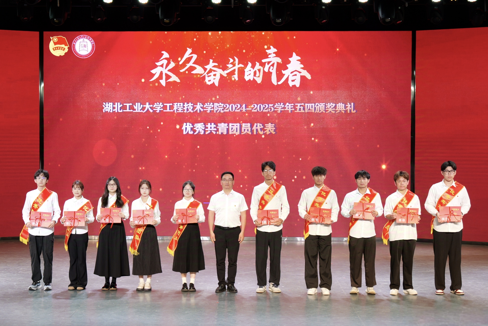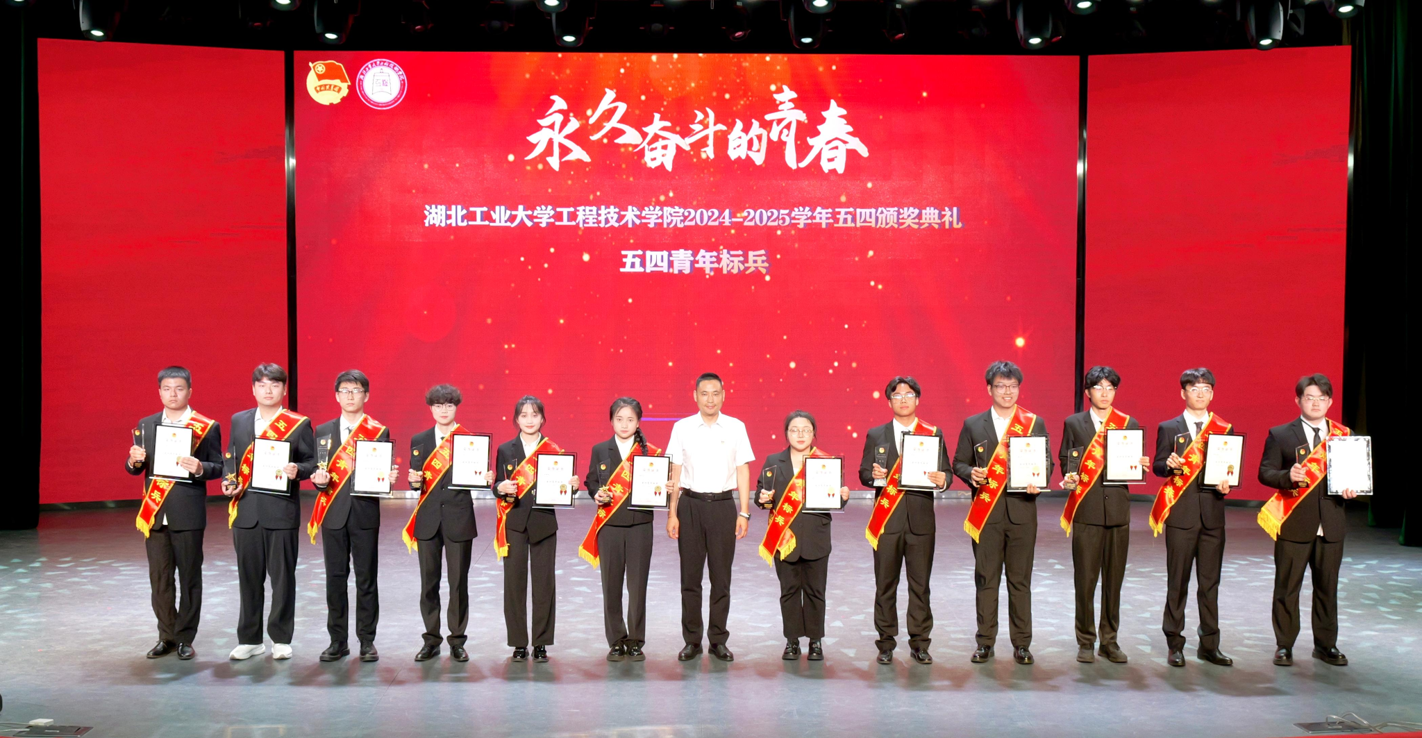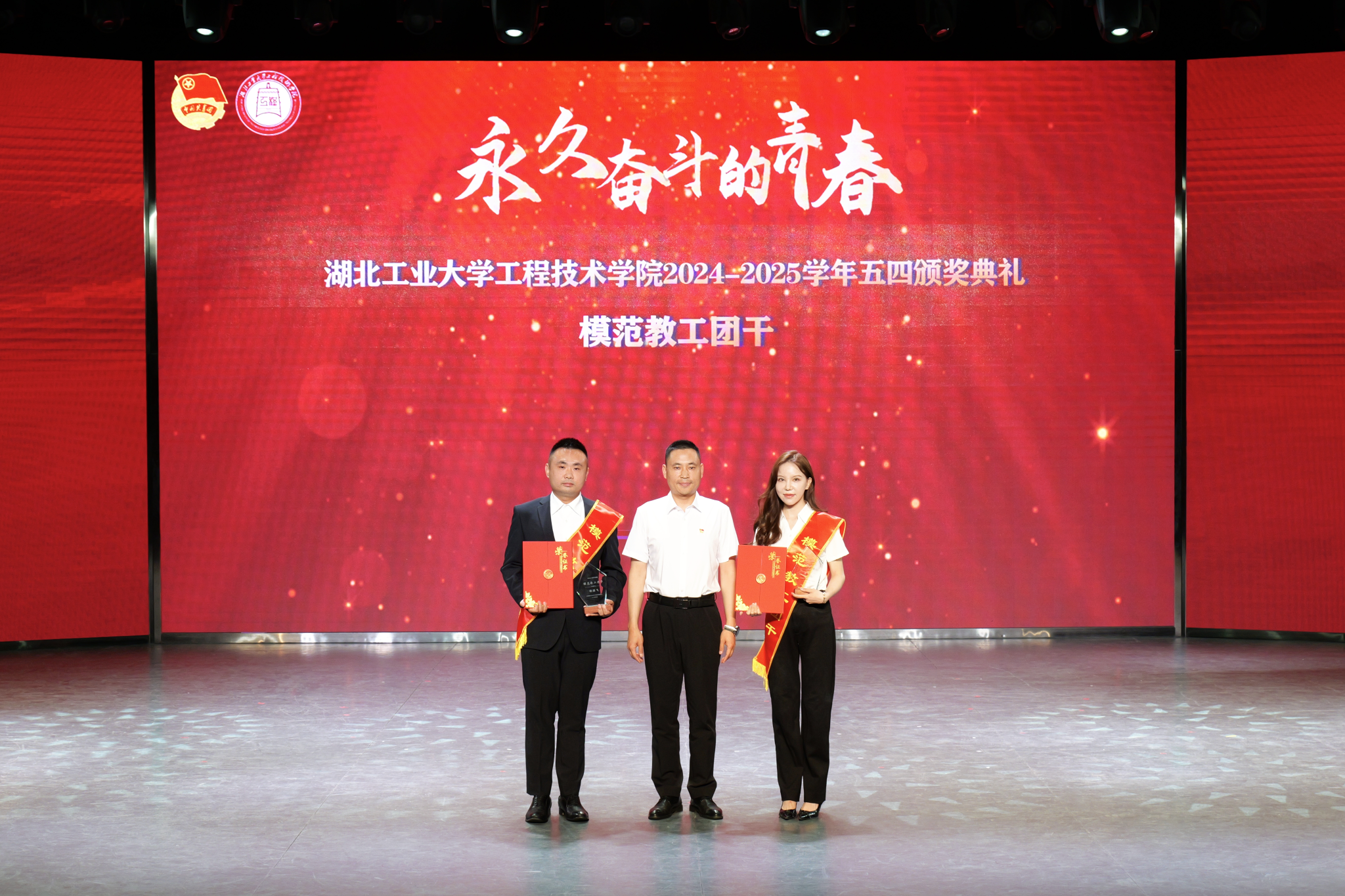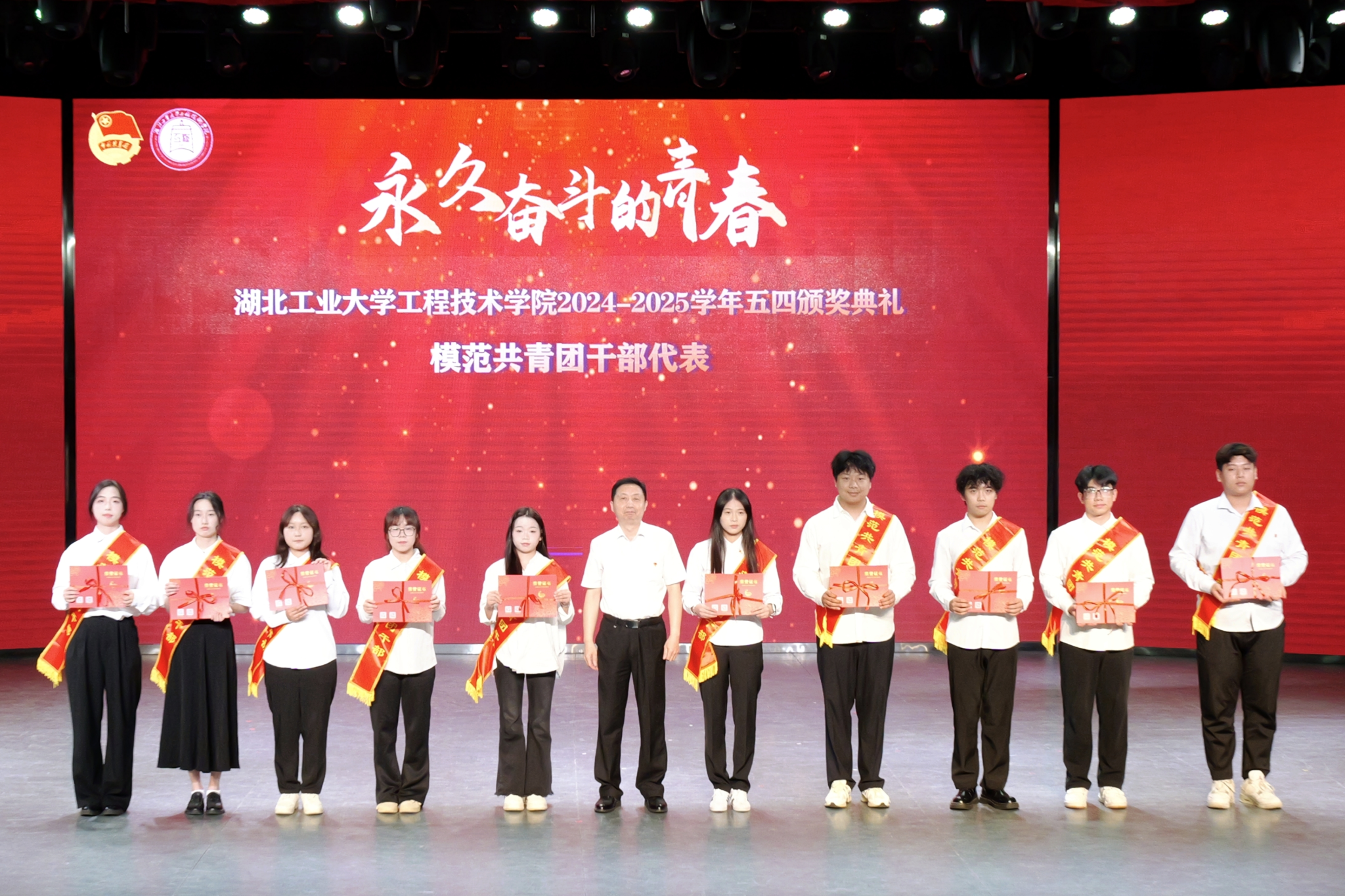 颁奖典礼环节,学院党委副书记曹仲伟宣读《湖北工业大学工程技术学院2024-2025学年五四先进集体和先进个人的决定》。管理系团总支、土木系团总支获评“红旗团总支”,生化工程系学生会、机械工程系学生会获评“优秀学生会”。学院授予“青马工程”团支部等19个团支部“活力团支部”荣誉称号,瞿弋涵、彭骥飞获评“模范教工团干部”,王昊擘等12人获评“五四青年标兵”,张宁珈等139人获评“模范共青团干部”,黄炳熹等257人获评“优秀学生干部”,授予姚宇喆等414人获评“优秀共青团员”称号。