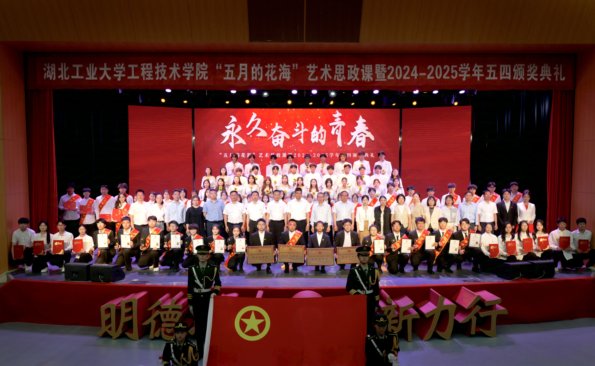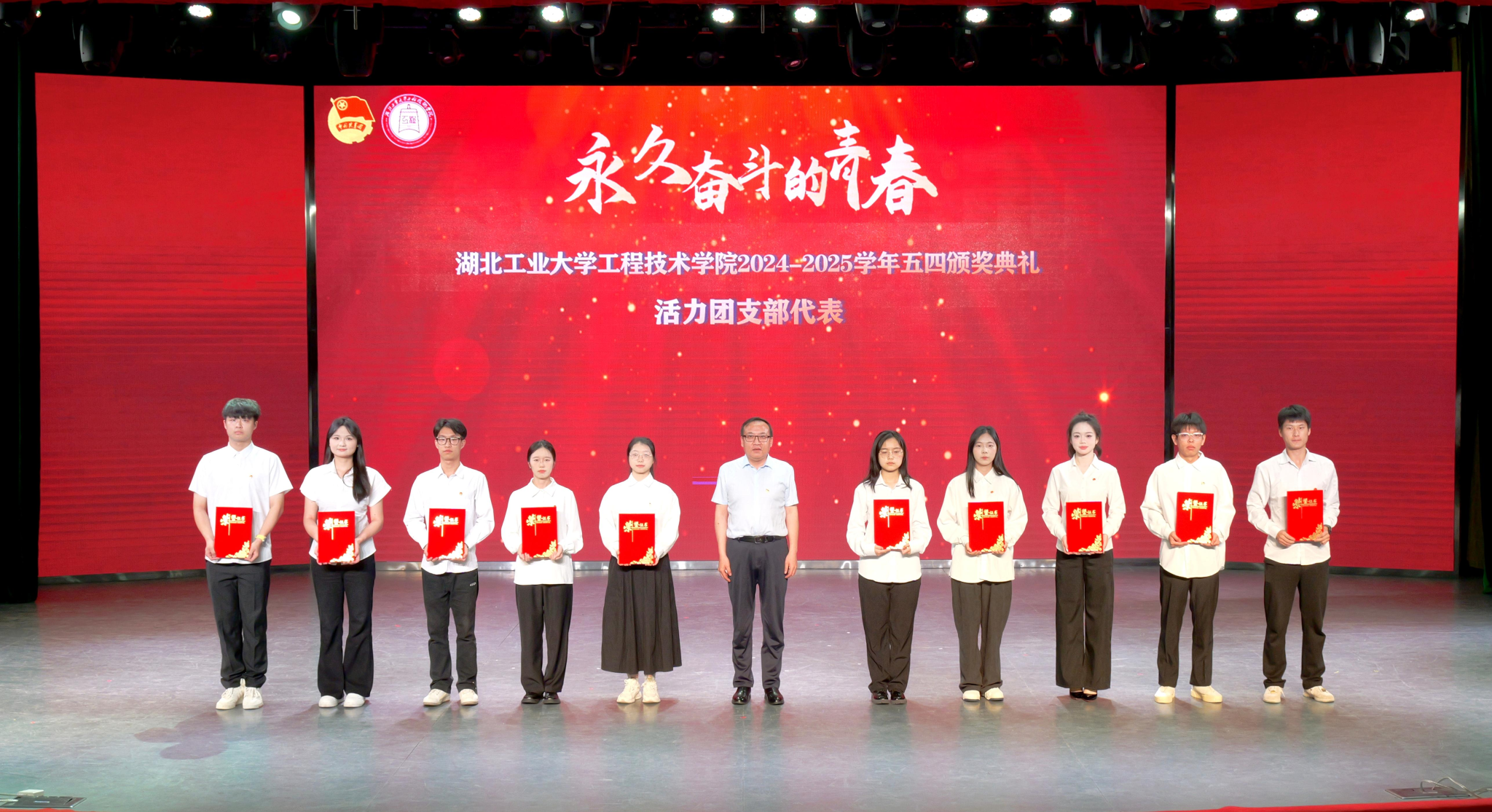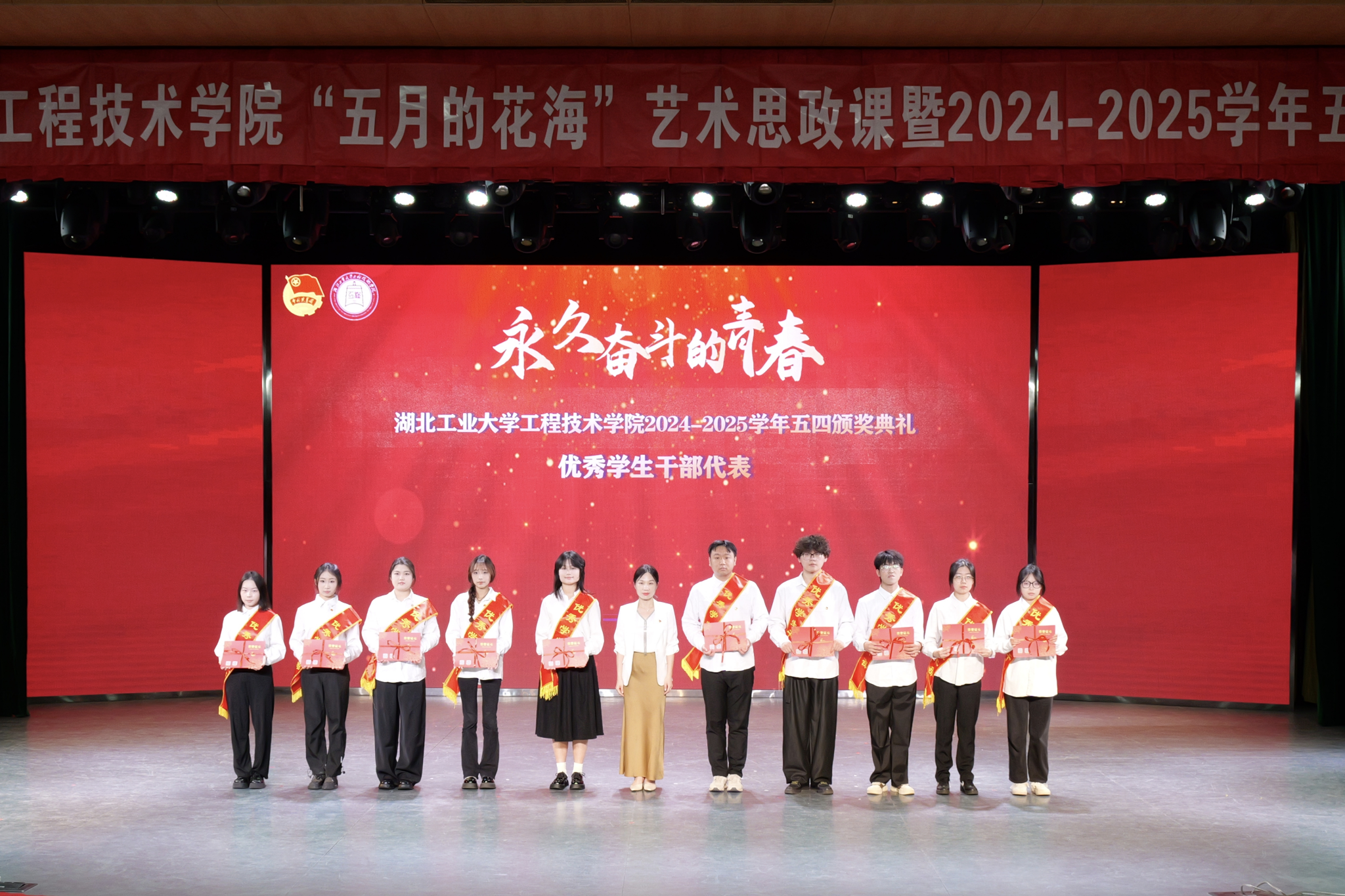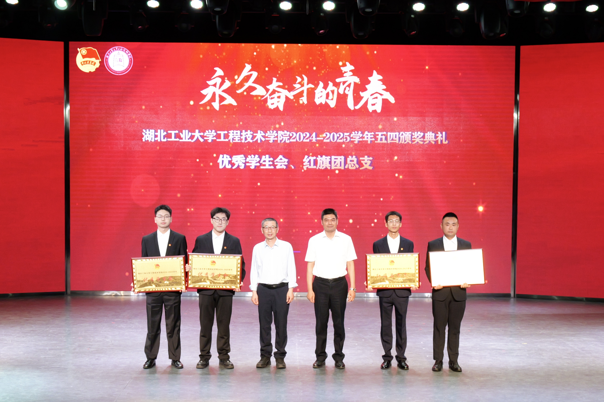 颁奖典礼环节,学院党委副书记曹仲伟宣读《湖北工业大学工程技术学院2024-2025学年五四先进集体和先进个人的决定》。管理系团总支、土木系团总支获评“红旗团总支”,生化工程系学生会、机械工程系学生会获评“优秀学生会”。学院授予“青马工程”团支部等19个团支部“活力团支部”荣誉称号,瞿弋涵、彭骥飞获评“模范教工团干部”,王昊擘等12人获评“五四青年标兵”,张宁珈等139人获评“模范共青团干部”,黄炳熹等257人获评“优秀学生干部”,授予姚宇喆等414人获评“优秀共青团员”称号。