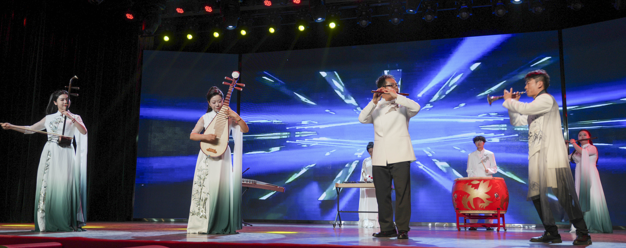 在第四篇章“焕新·华夏韵”中,大学生艺术团楚韵民乐团带来国乐合鸣《好汉鸣笛》,将传统民乐与现代电子结合,将“好汉歌”的侠义精神,升华为当代青年不惧试错、突破陈规的成长宣言。随后,艺术团专兼职老师带来国韵音诗舞《千载遇知音》,通过折扇、水袖、剑术三种传统艺术载体,展现中华文化的浪漫诗意与精神品格。最后,由大学生艺术团金石合唱团带来混声合唱《世界赠予我的》《一路生花》,用温暖、励志的歌词和旋律,以青春之声演绎新时代青年“脚踏山河、心向寰宇”的奋进之姿。