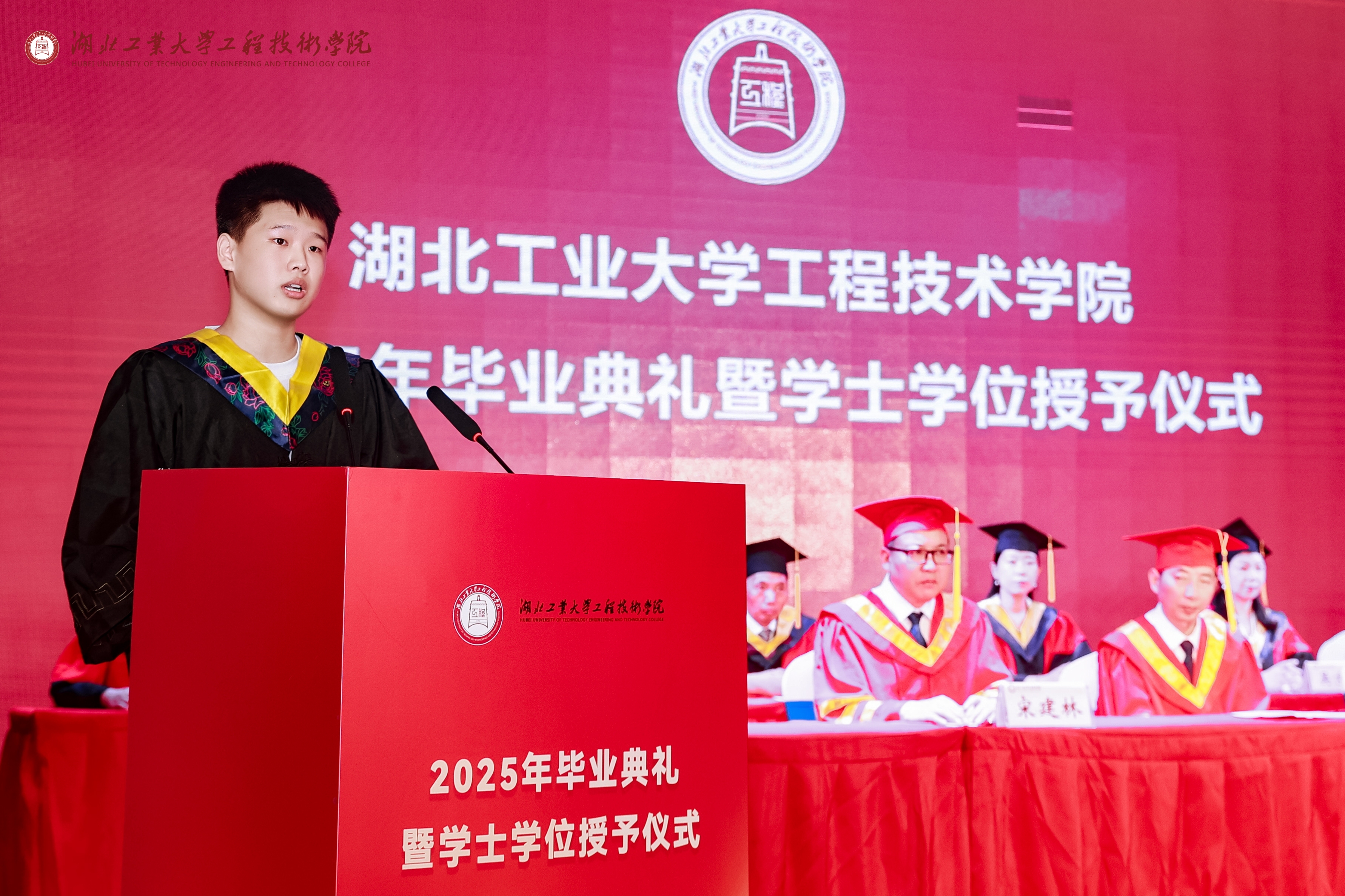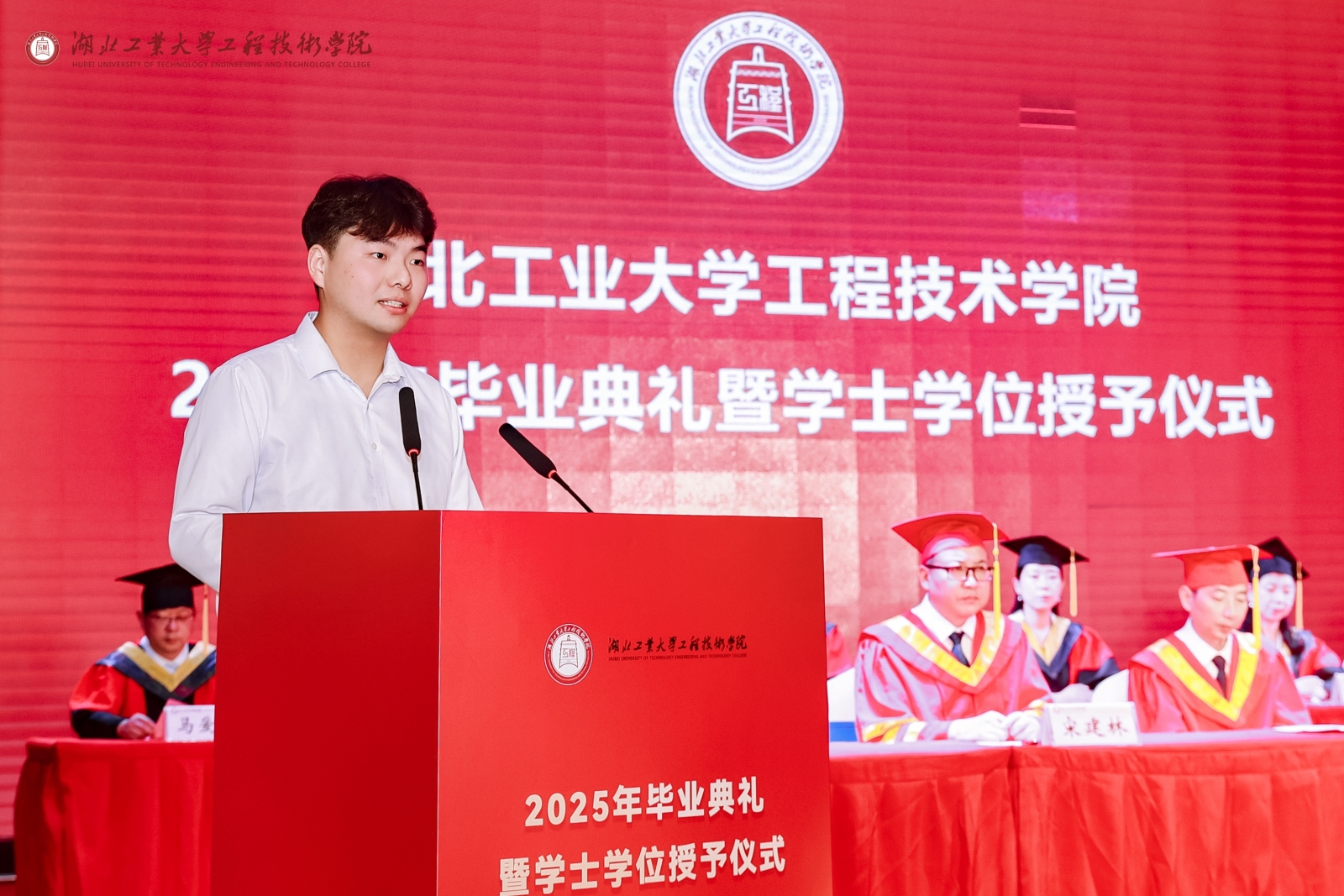 来自机械工程系毕业生邓炜凡同学作为毕业生代表发言,字里行间无不流露出对母校深深的眷恋与不舍。他用真挚的情感,讲述着自己在大学时光里的成长与收获,同时也表达了对未来的美好憧憬与坚定信念。管理系郭凯旋同学,代表在校生为毕业生送上祝福。