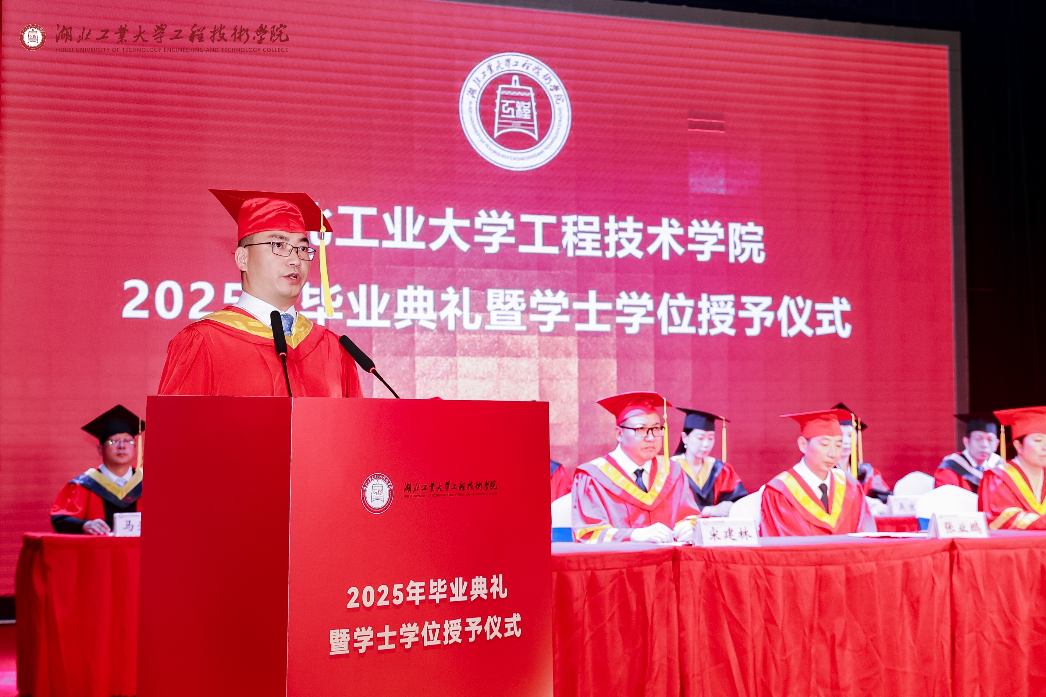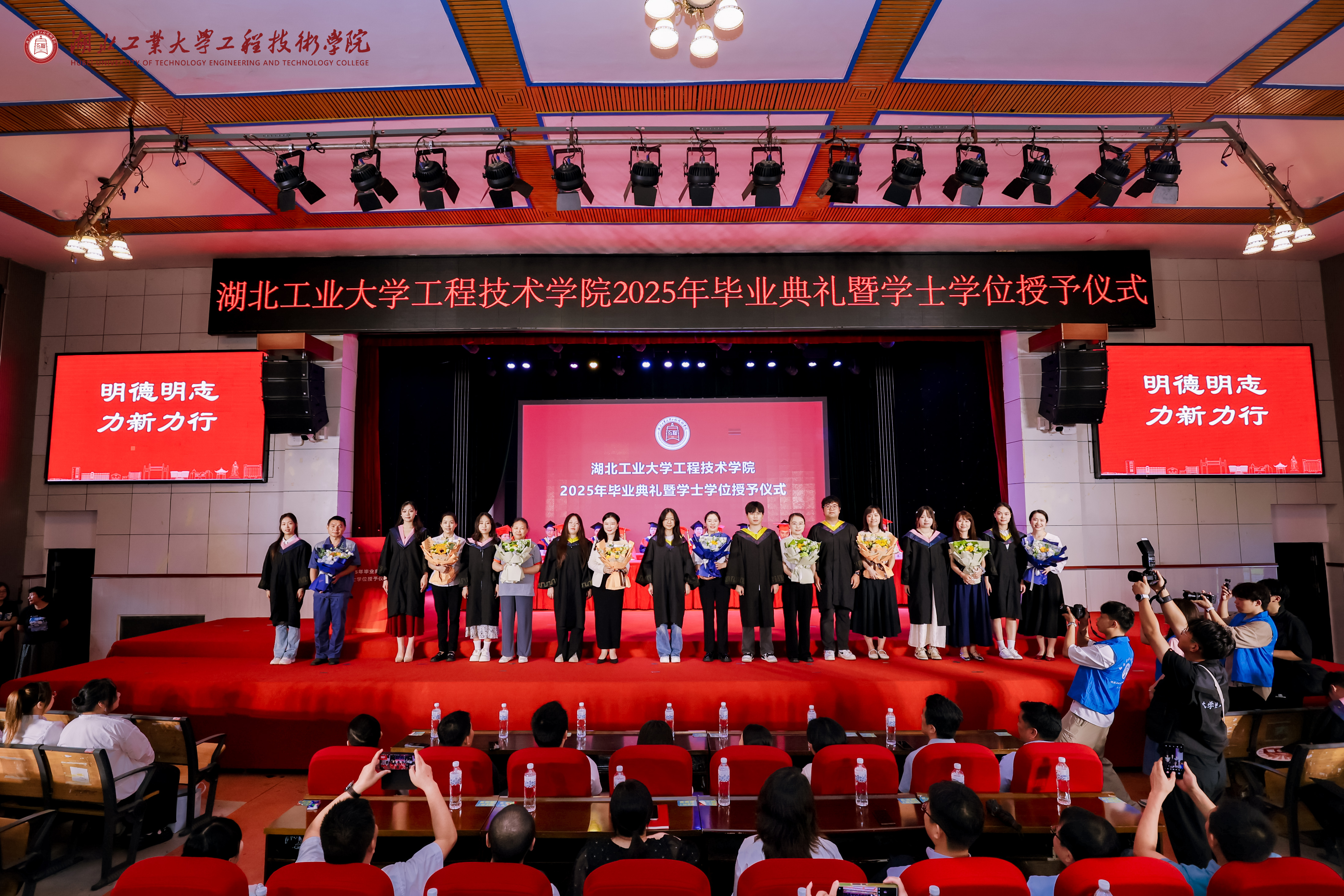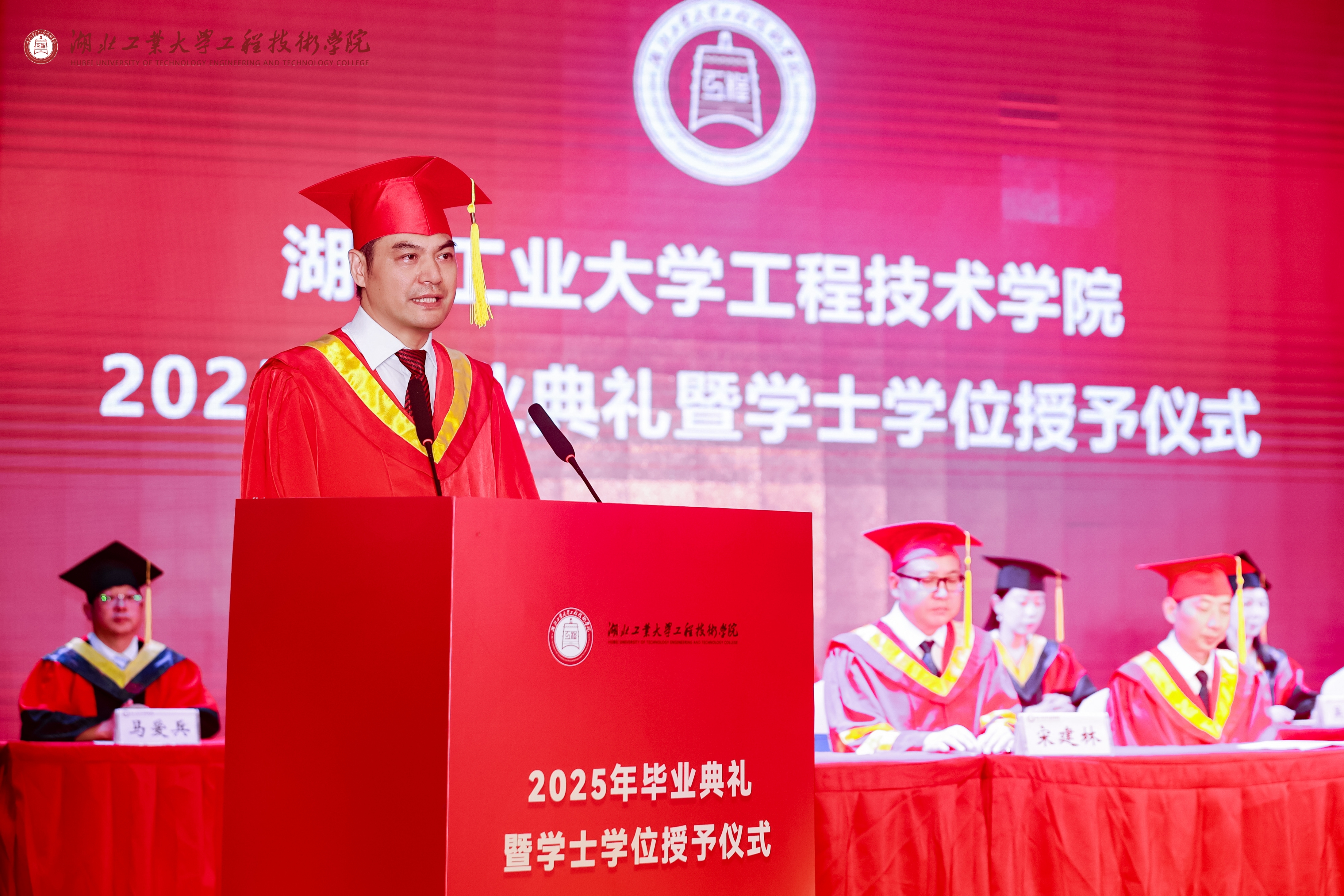巡司河畔,骊歌悠扬。6月10日上午,湖北工业大学工程技术学院2025年毕业典礼暨学士学位授予仪式在学校中区大礼堂隆重举行。湖北工业大学党委副书记胡晓艳为优秀毕业生代表颁奖。学院领导朱爱军、张业鹏、曹仲伟、宋建林、孟涛、查纯、姜伟等出席典礼。学院党委副书记曹仲伟主持典礼。