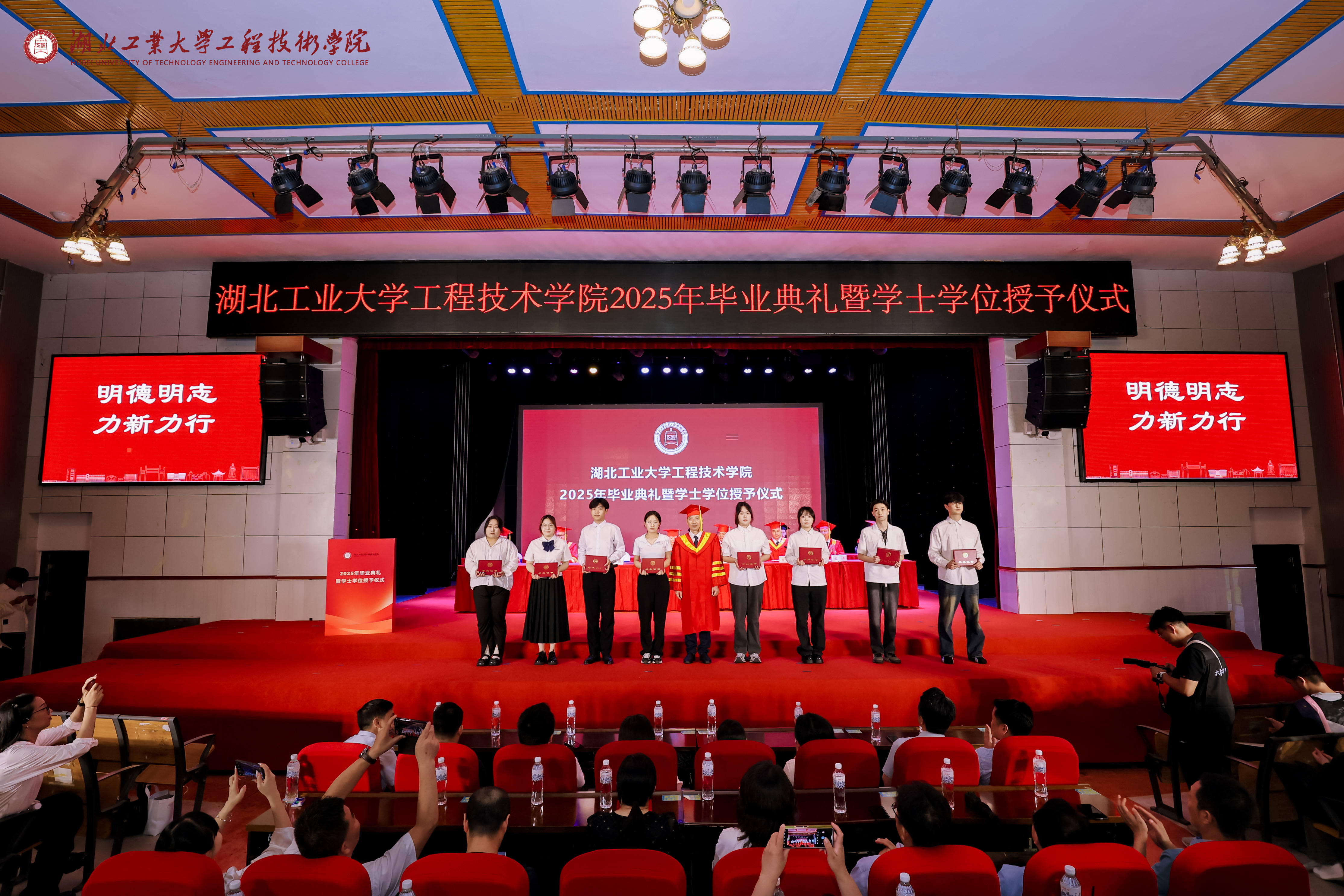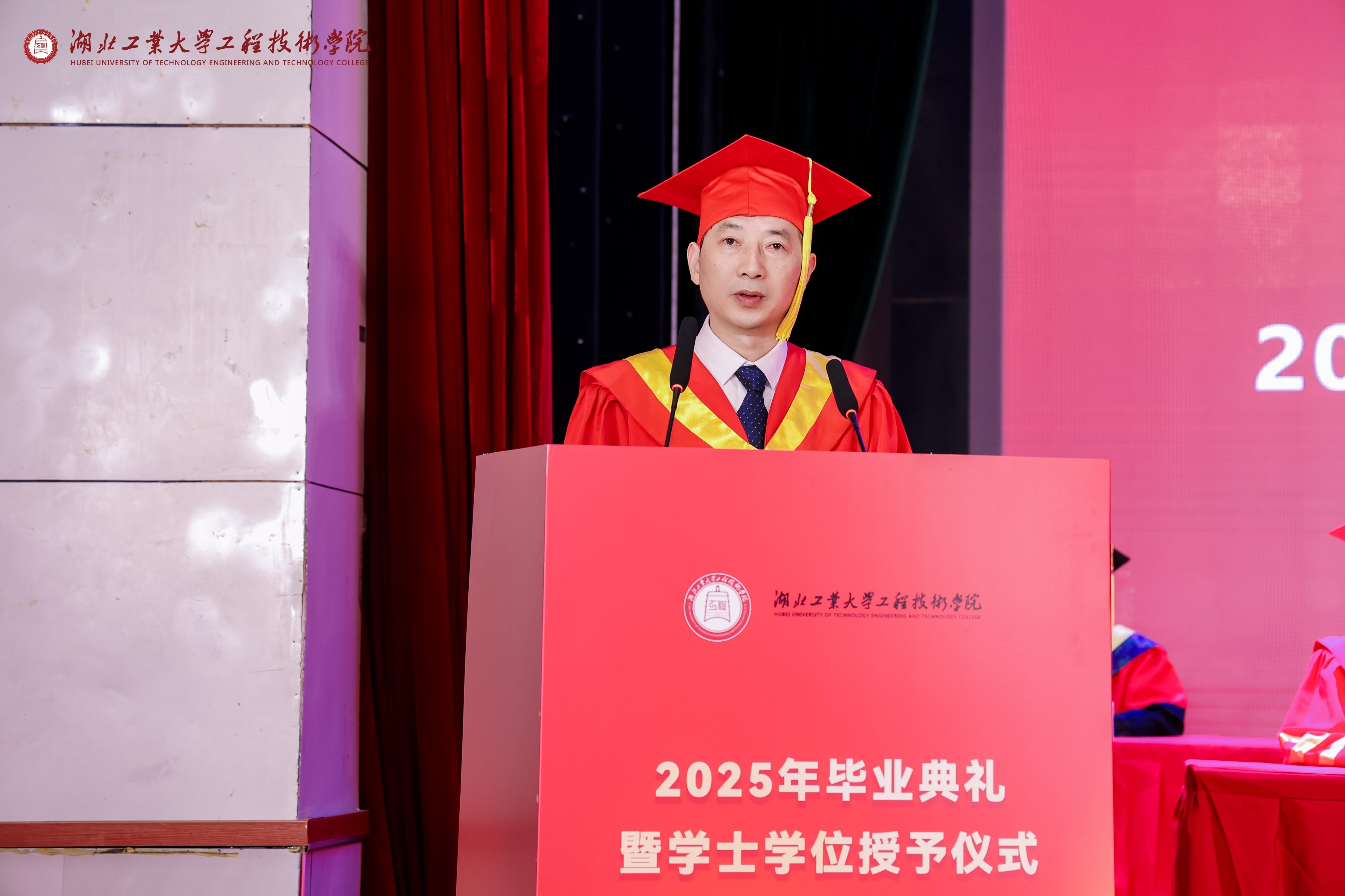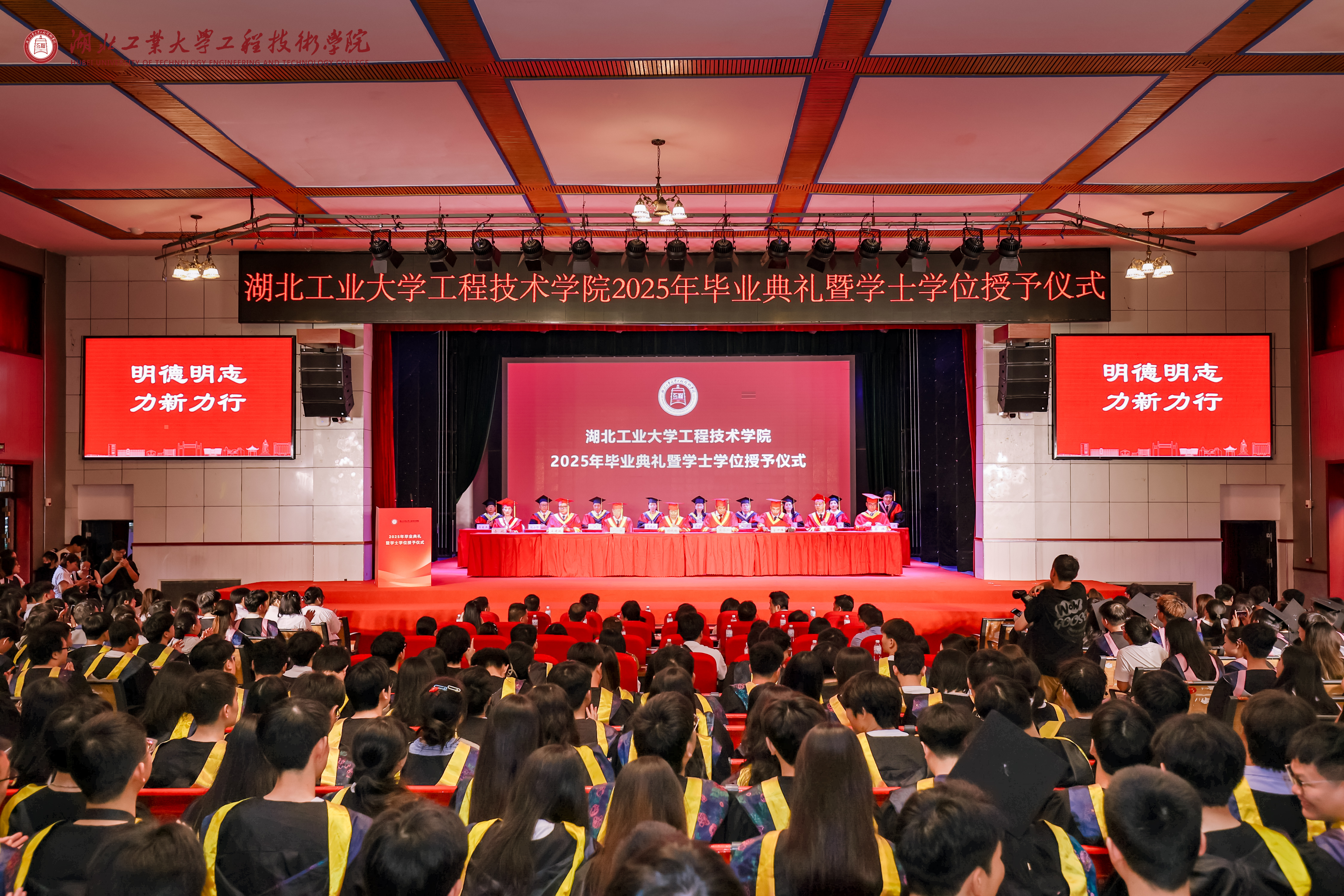 巡司河畔,骊歌悠扬。6月10日上午,湖北工业大学工程技术学院2025年毕业典礼暨学士学位授予仪式在学校中区大礼堂隆重举行。湖北工业大学党委副书记胡晓艳为优秀毕业生代表颁奖。学院领导朱爱军、张业鹏、曹仲伟、宋建林、孟涛、查纯、姜伟等出席典礼。学院党委副书记曹仲伟主持典礼。