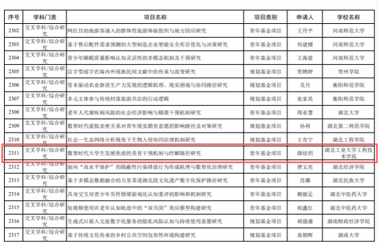 9月25日,教育部社会科学司公布了《2025年度教育部人文社会科学研究规划基金、青年基金、自筹经费项目评审结果》。我院公共课部颜佳玥老师主持的《数智时代大学生发展焦虑的美育干预机制与纾解路径研究》成功获批教育部人文社科青年基金项目,这是继2024年我院首次获批教育部人文社科规划基金项目后,成功实现“国家级”科研项目不断线。