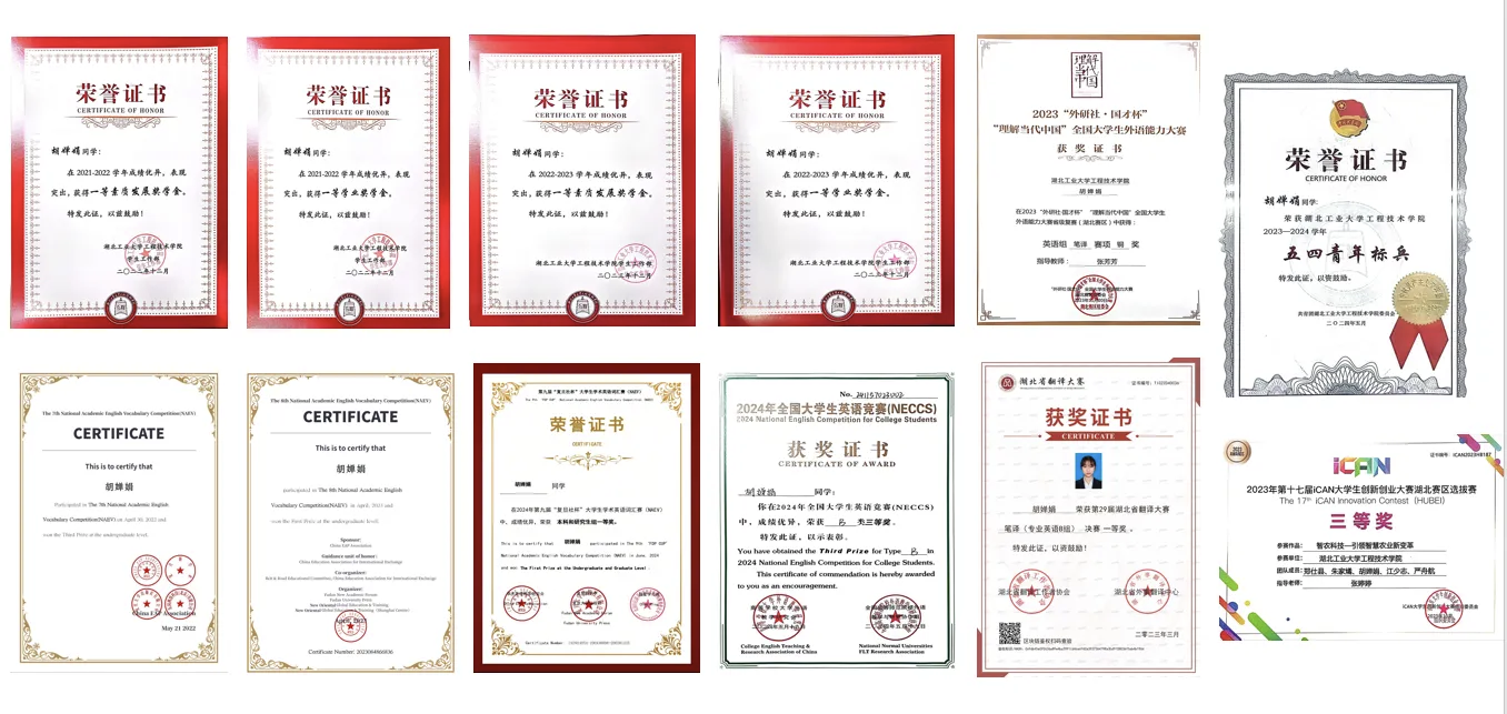 翻开胡婵娟的履历表,跃动着令人瞩目的数据:她连续三年获得学业一等奖学金,连续两年获得素质发展一等奖学金,连续两年获得国家励志奖学金,大学英语四六级540+,通过专四并获得过国家级奖项4项,省级奖项4项,校级奖项二十余项,湖北省翻译工作者协会会员。