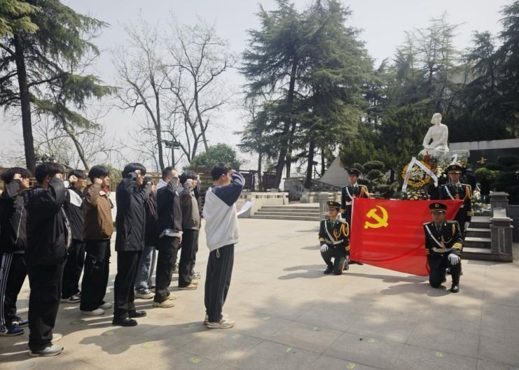 在苍松翠柏的掩映下的向警予烈士陵园。学生们整齐列队,辅导员老师神情庄重,引导学校国旗护卫队的队员步伐整齐地将花圈敬献于雕像前,全体学生肃立默哀一分钟,以此表达对向警予烈士无尽的追思和崇高敬意。来自机械工程系学生党支部党员胡海洋发言,他结合向警予烈士“革命不忘读书,读书不忘革命”的箴言,呼吁青年学子以先烈为榜样,在科研攻关时脚踏实地,在服务群众中甘于奉献,以清正廉洁的作风展现党员的精神风貌。发言结束后,胡海洋带领全体党员面向党旗,高举右拳,重温入党誓词,“我志愿加入中国共产党……”铿锵誓言回荡在纪念馆广场,青年学子目光坚毅。
