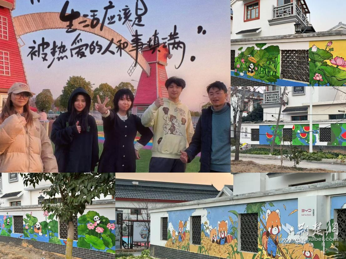 此外,黄俊雅、苏靖轩、周东阳等同学还赴湖北省荆门市迎接村参与墙绘创作,用艺术为乡村文化和景观建设添彩。他们的创作不仅让单调的墙面变得生动,还增进了团队合作,实践了艺术专业知识。同学们纷纷表示,将团结一心,共同为乡村振兴出力。