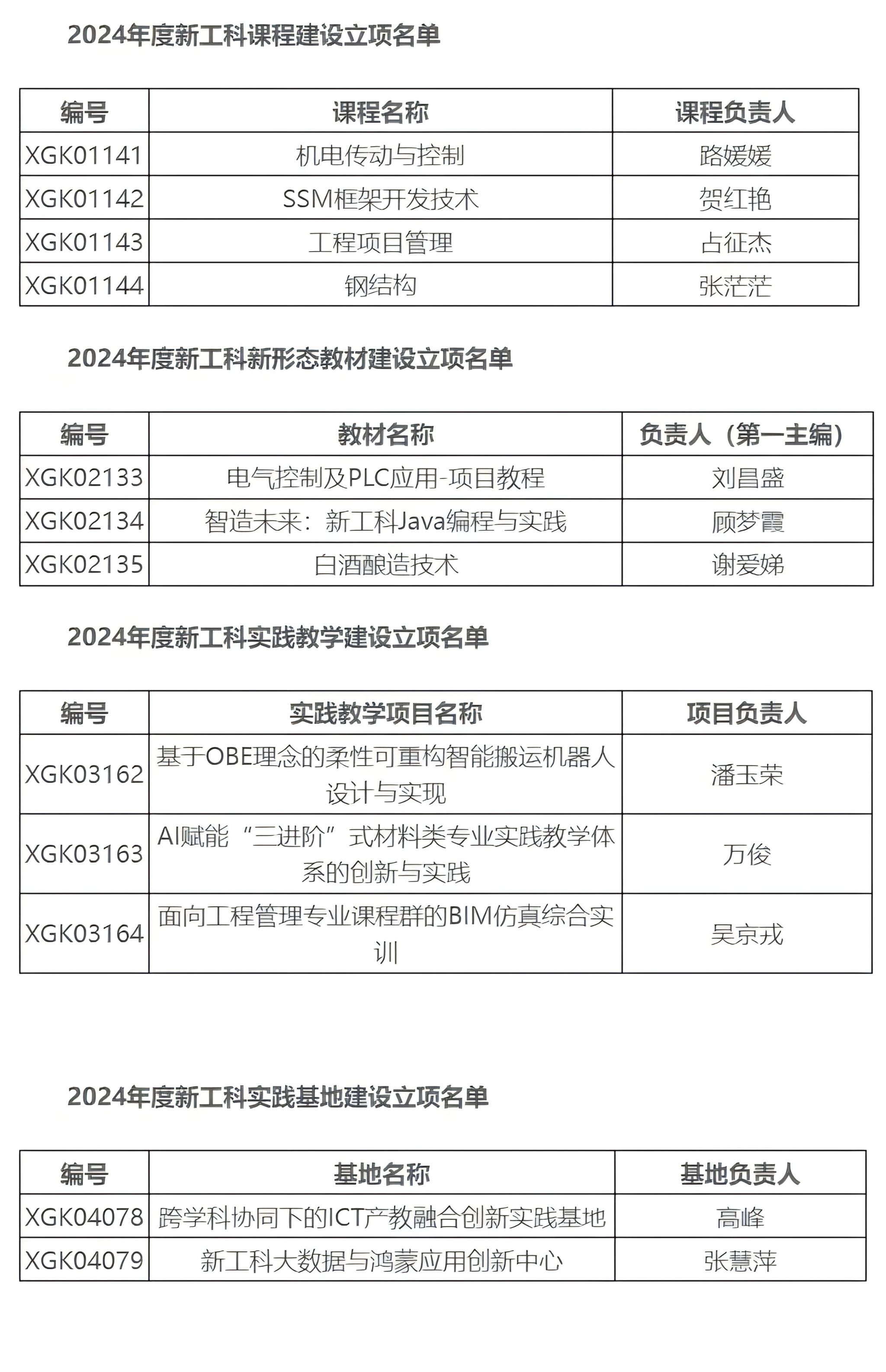 为加快推进湖北省本科高校工科专业转型升级,近日,湖北省教育厅正式下发《省教育厅关于公布2024年度新工科建设项目的通知》(鄂教高函〔2025〕4号),湖北工业大学工程技术学院《机电传动与控制(课程)》等12个项目成功获批立项。其中,新工科课程建设项目4项,新工科新形态教材建设项目3项,新工科实践教学建设项目3项,新工科实践基地建设项目2项,湖北工业大学工程技术学院获批项目的总数、分项数均位居全省同类院校第一方阵。