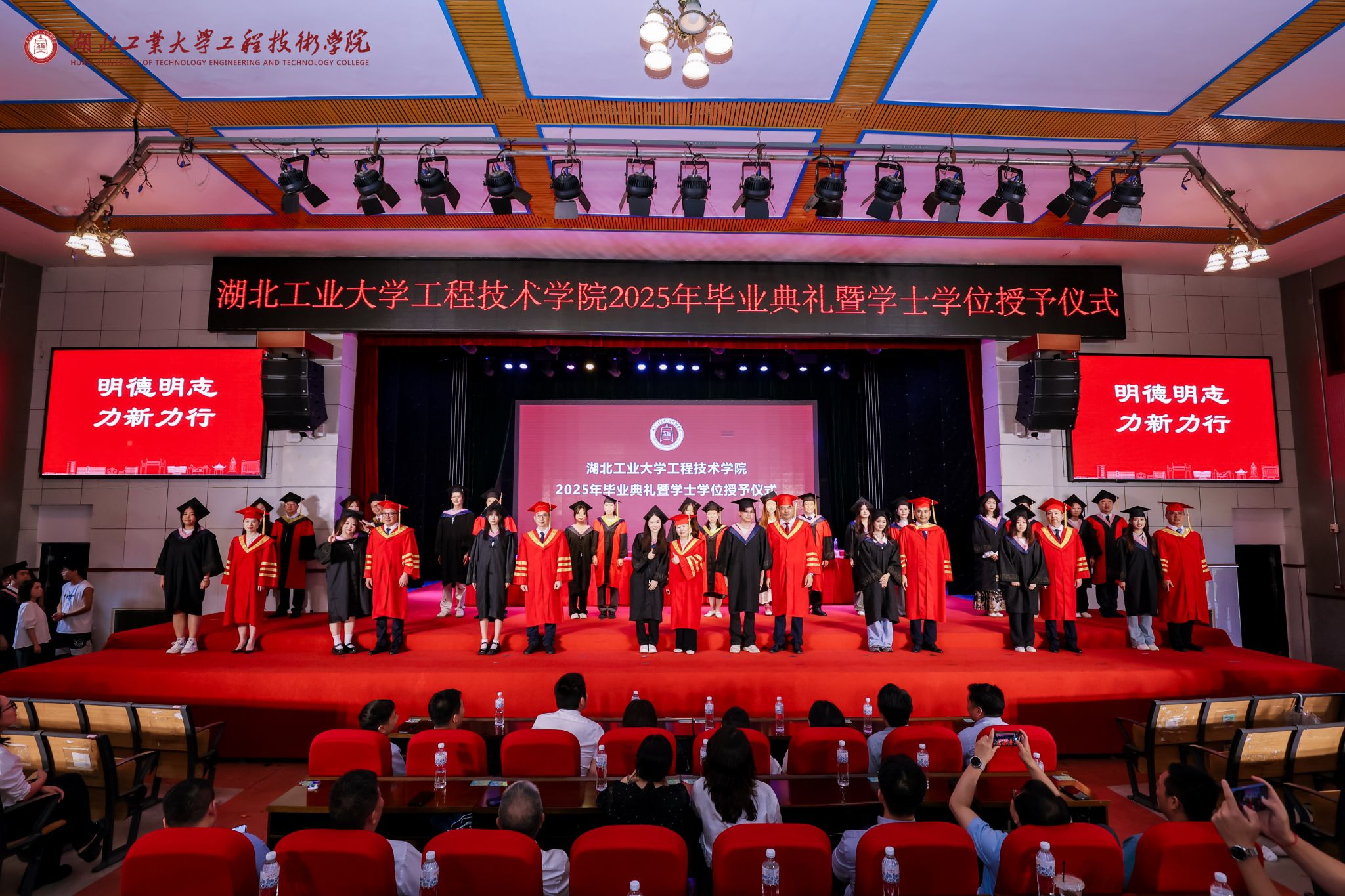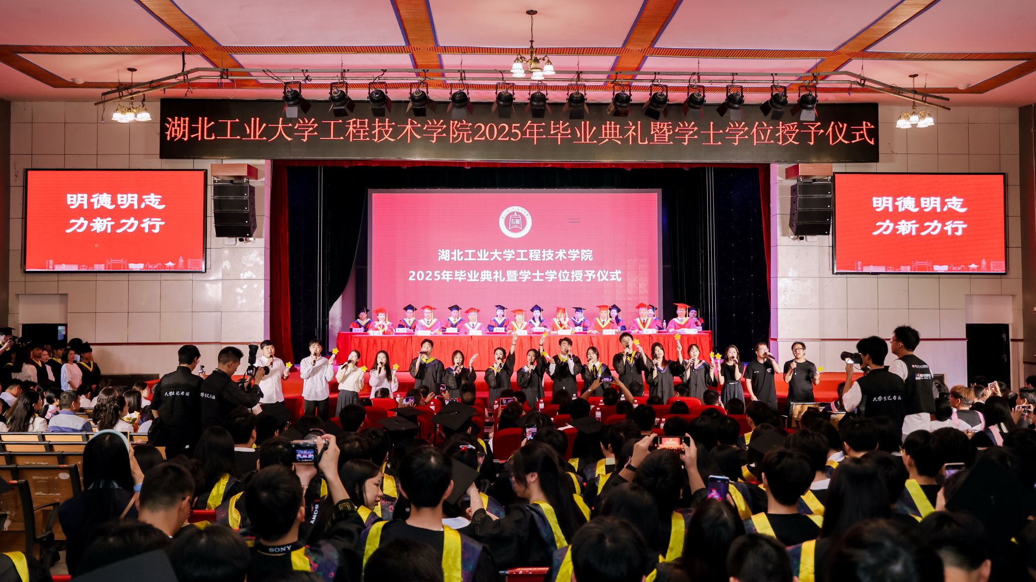 巡司河畔,骊歌悠扬。6月10日上午,湖北工业大学工程技术学院2025年毕业典礼暨学士学位授予仪式在学校中区大礼堂隆重举行。湖北工业大学党委副书记胡晓艳为优秀毕业生代表颁奖。学院领导朱爱军、张业鹏、曹仲伟、宋建林、孟涛、查纯、姜伟等出席典礼。学院党委副书记曹仲伟主持典礼。