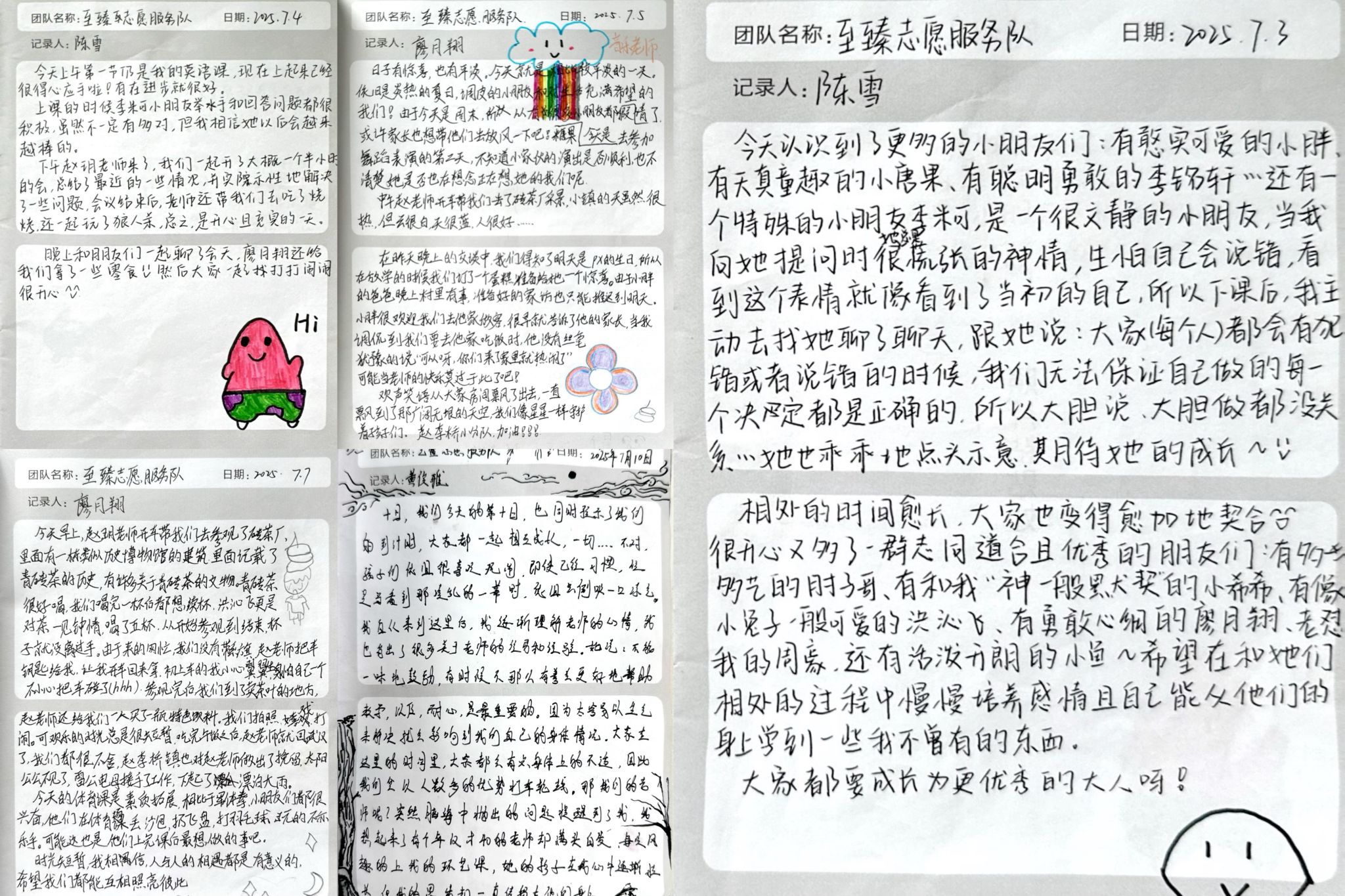 除了画面,文字更打动人心。志愿者们在手账中记录下课堂点滴、成长感悟与温暖瞬间:“现在上课已经得心应手啦!”“人与人的相遇都有意义,愿我们彼此照亮。”字里行间,有初登讲台的紧张,有困难时的坚持,更有孩子们纯真笑容带来的治愈与感动。手账的尾页,几乎每一本都成为了签名册和留言板。志愿者和孩子们纷纷留下签名和祝福,让那些不舍的告别和殷切的祝愿得以永久珍藏。