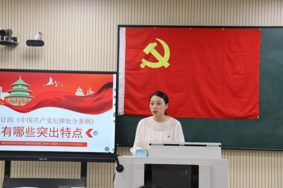 祝乐老师首先向2024届27位毕业生党员顺利完成学业,即将逐梦新征程表示热烈祝贺,随后以《中国共产党纪律处分条例》为主要内容讲授专题党课,并对毕业生党员提出三点希望:一要对组织忠诚担当讲政治。二要对工作尽职尽责讲实效。三要对党纪国法心存敬畏讲底线。“要时刻牢记党员身份、保持清醒头脑,坚守底线红线意识,时刻维护党纪国法的权威和尊严,讲纪律、守规矩、知敬畏、明底线,对国家负责、对社会负责、对自己负责。”祝乐老师说道。