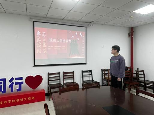 2024年12月6日,机械工程系在工二D408一场聚焦退伍复学大学生的座谈会于我校温情启幕,助力他们无缝衔接校园生活,锚定前行方向,传承军旅精神,激发参军热情。出席本次研讨会的有23级年级辅导员曹祥柱老师,以及机械系退伍大学生。