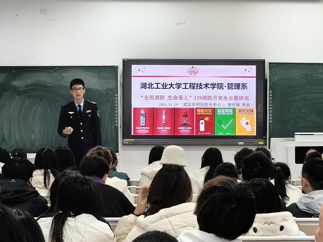 为提升校园消防安全意识,保障师生财产安全,近日,管理系特邀武汉市利民防火中心唐宇翔教官,举办了以“全民消防,生命至上”为主题的消防安全知识讲座。