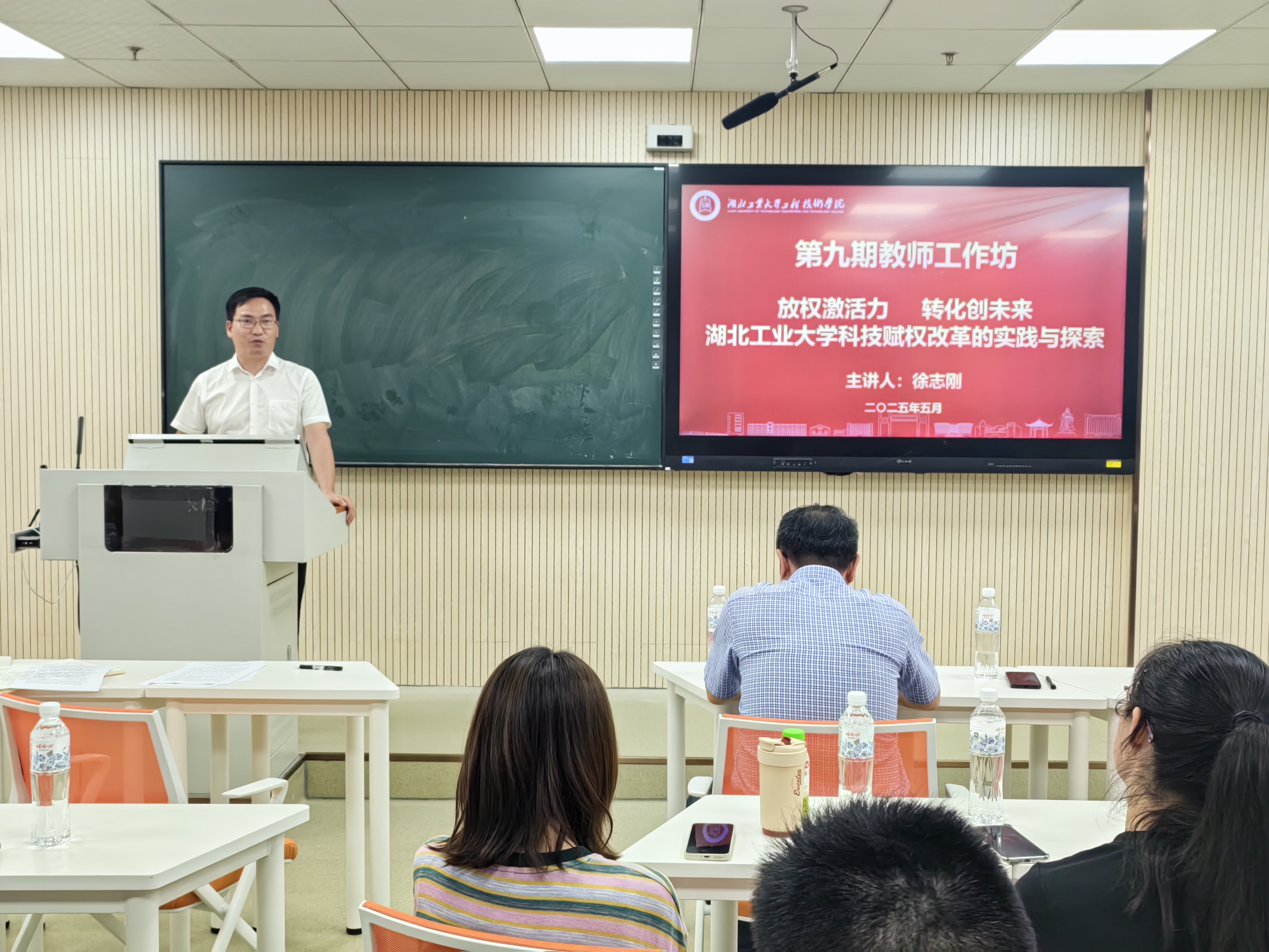 5月30日下午,科研部联合教师工作部在南综204举办了第九期教师工作坊,本次活动主题为《放权激活力转化创未来湖北工业大学科技赋权改革的实践与探索》,特邀湖北工业大学科技成果转化中心主任兼副院长徐志刚担任主讲。学院副院长姜伟出席活动。