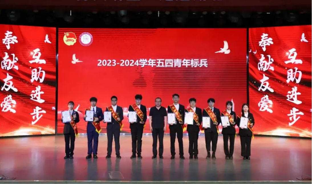 第二篇章,星辰青年。团委书记庞雯宣读《关于表彰湖北工业大学工程技术学院2023-2024学年五四先进集体和先进个人的决定》。学院领导为受表彰集体和个人代表颁发荣誉奖牌和证书。现场为109名青年举行了入团宣誓仪式。