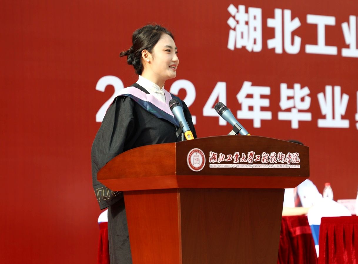 艺术设计系毕业生李世一同学作为毕业生代表发言。她回忆着四年前初入校园的青涩,校园的每处使她难以忘怀,与老师、与同学的点滴收藏于心,她祝福2024届毕业生前程似锦,母校蒸蒸日上。