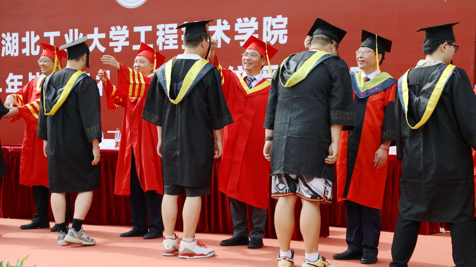 最后,湖北工业大学党委常委、副校长、工程技术学院董事长王侃率全体院领导、九系教授为在场的本科毕业生拨穗正冠,颁发学位证书,并合影留念。