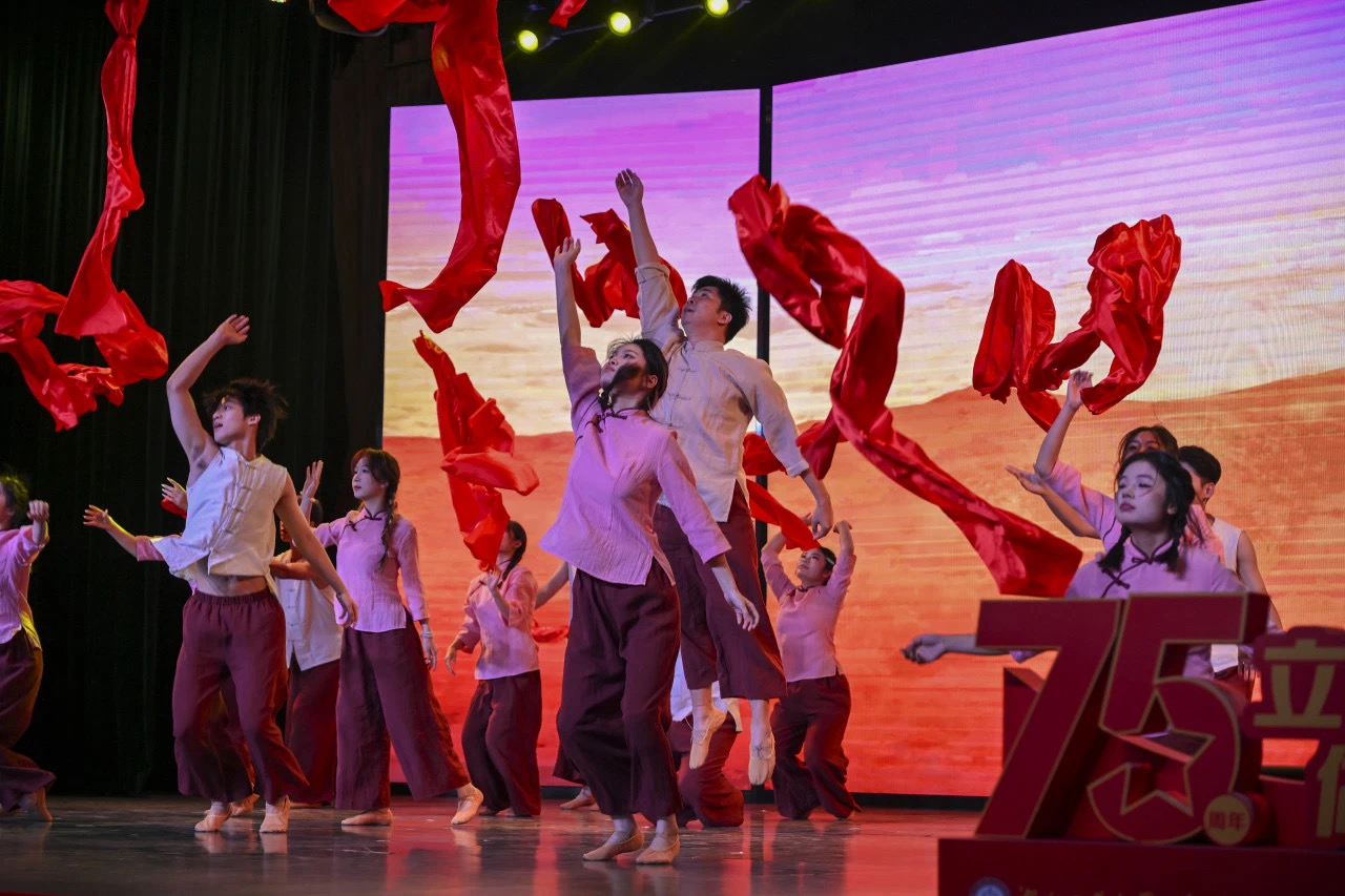 时光轮转看今朝,历史情景剧《如愿》讲述了青春的力量,舞蹈《映山红》激荡人心,承载着几代人的红色记忆。诗乐演唱《送别》带人们回到充满诗意的时代。朗诵《毛泽东的诗词人生》慷慨激昂,舞蹈《东方红》演绎了东方最亮眼的红色,歌颂伟人的不朽风采。大合唱《领航》唱响了礼赞百年风华、奋斗崭新时代的昂扬主旋律。最后,晚会在全场高唱《歌唱祖国》的歌声中落下帷幕。