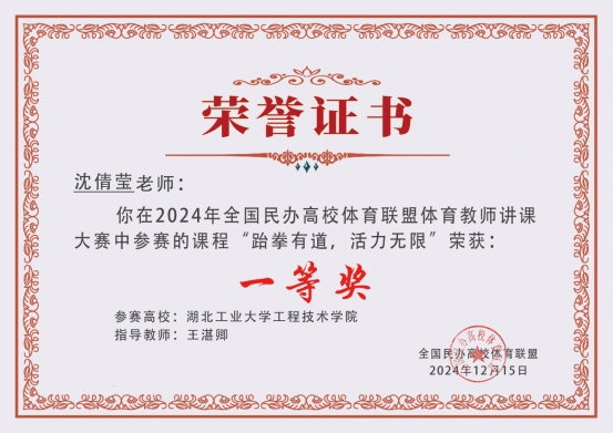 沈倩莹老师的参赛课程“跆拳有道,活力无限”,将跆拳道的精神内涵与运动技巧巧妙融合,其课程以其独特的视角、丰富的内容及高效的教学方法,赢得了评委和观众的一致好评,斩获大赛一等奖。