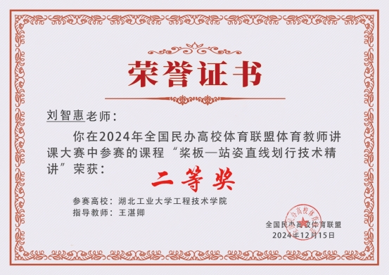 刘智惠老师则以“桨板一站姿直线划行技术精讲”为题,将水上运动的乐趣与专业技巧相结合,通过细致入微的技术解析与实践操作指导,让学生们在轻松愉快的氛围中掌握了桨板运动的基本技能,最终荣获二等奖。